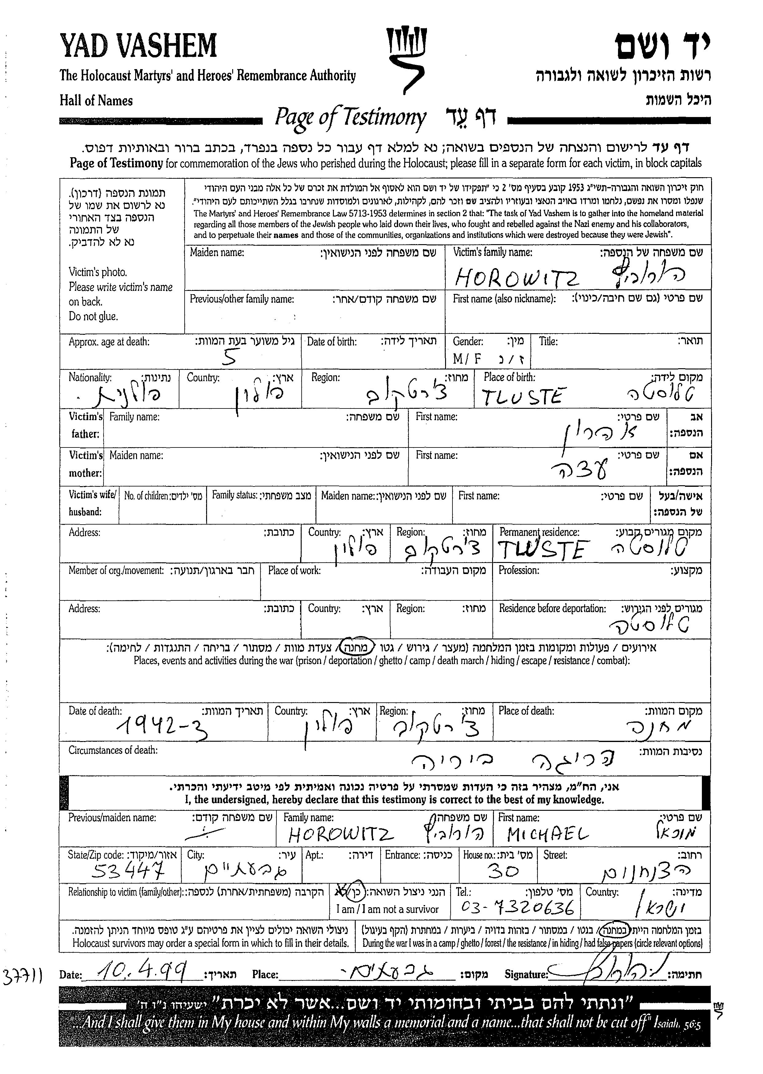 Horowitz prénom inconnu Tluste, Pologne Feuille de témoignage