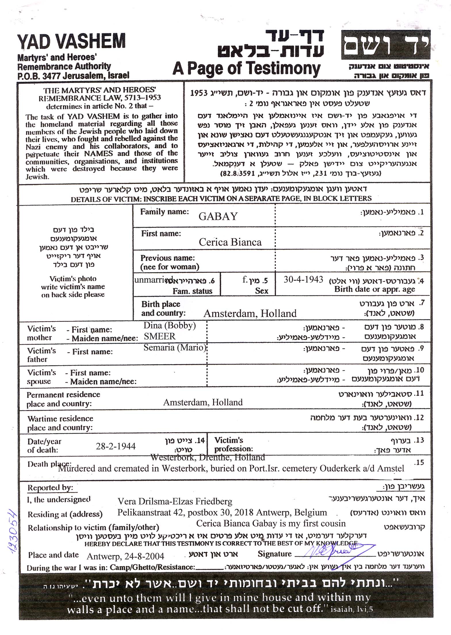 | Gabay | Cerica Bianca | 1943 | Amsterdam, Pays-Bas | Feuille de témoignage |