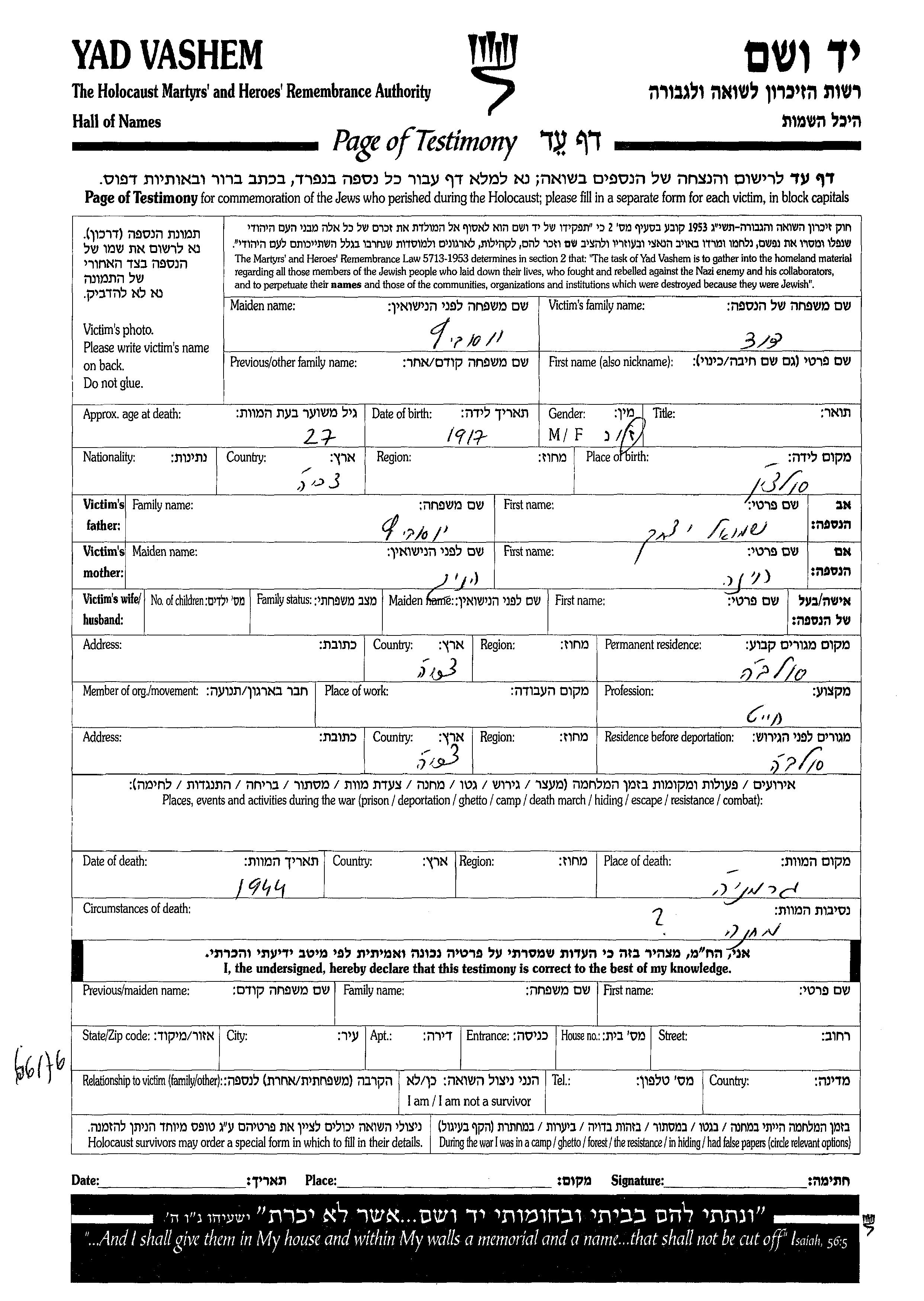 Recherche par date de la mort pendant la période de la Shoah: 1933-1945. Sélectionnez 'Exact'; dans la liste pour rechercher l'année exacte, ou sélectionner '+/- 2 ans'; ou '+/- 5 ans