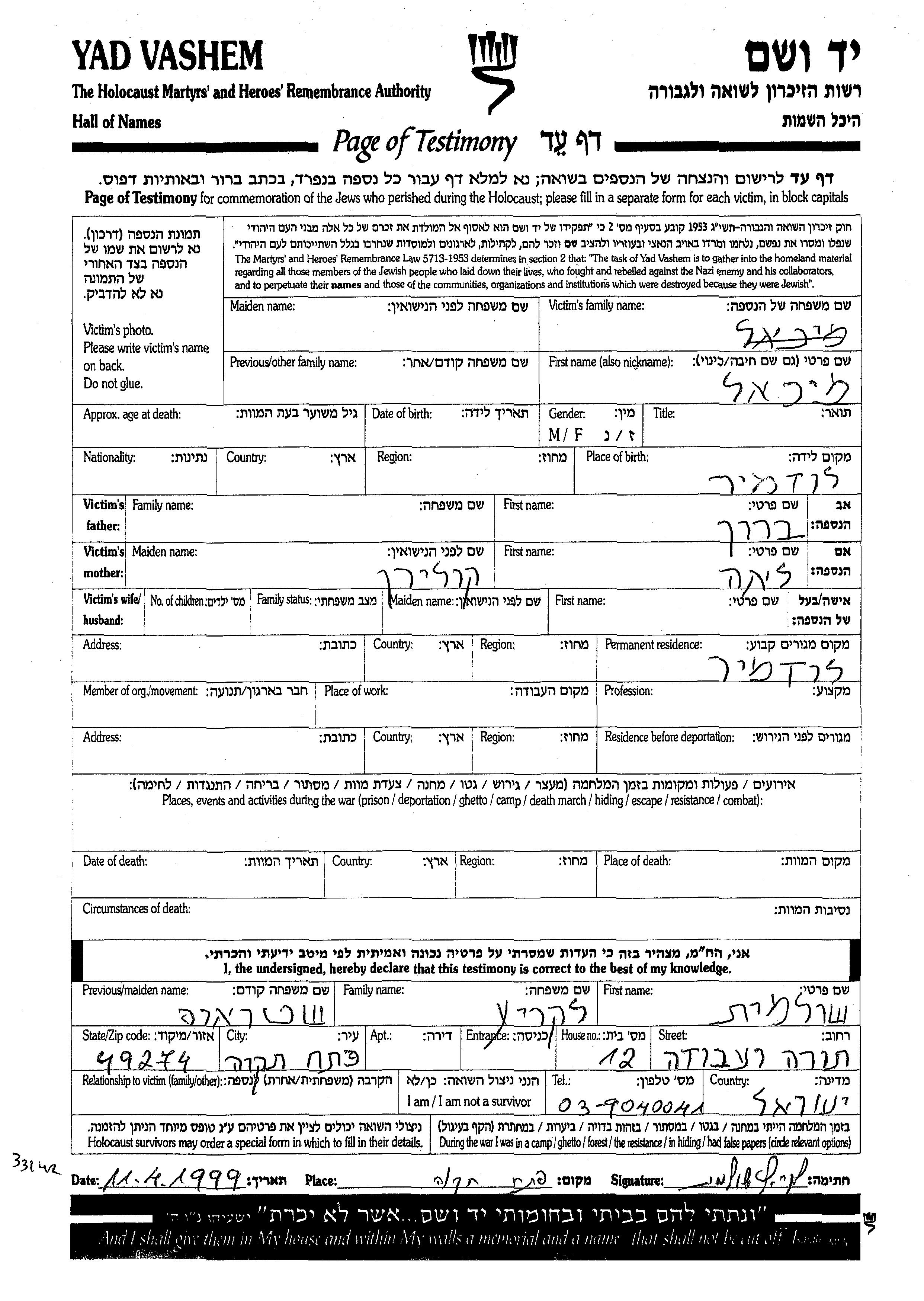 Yad Vashem - Pages of Testimony Names Memorial Collection