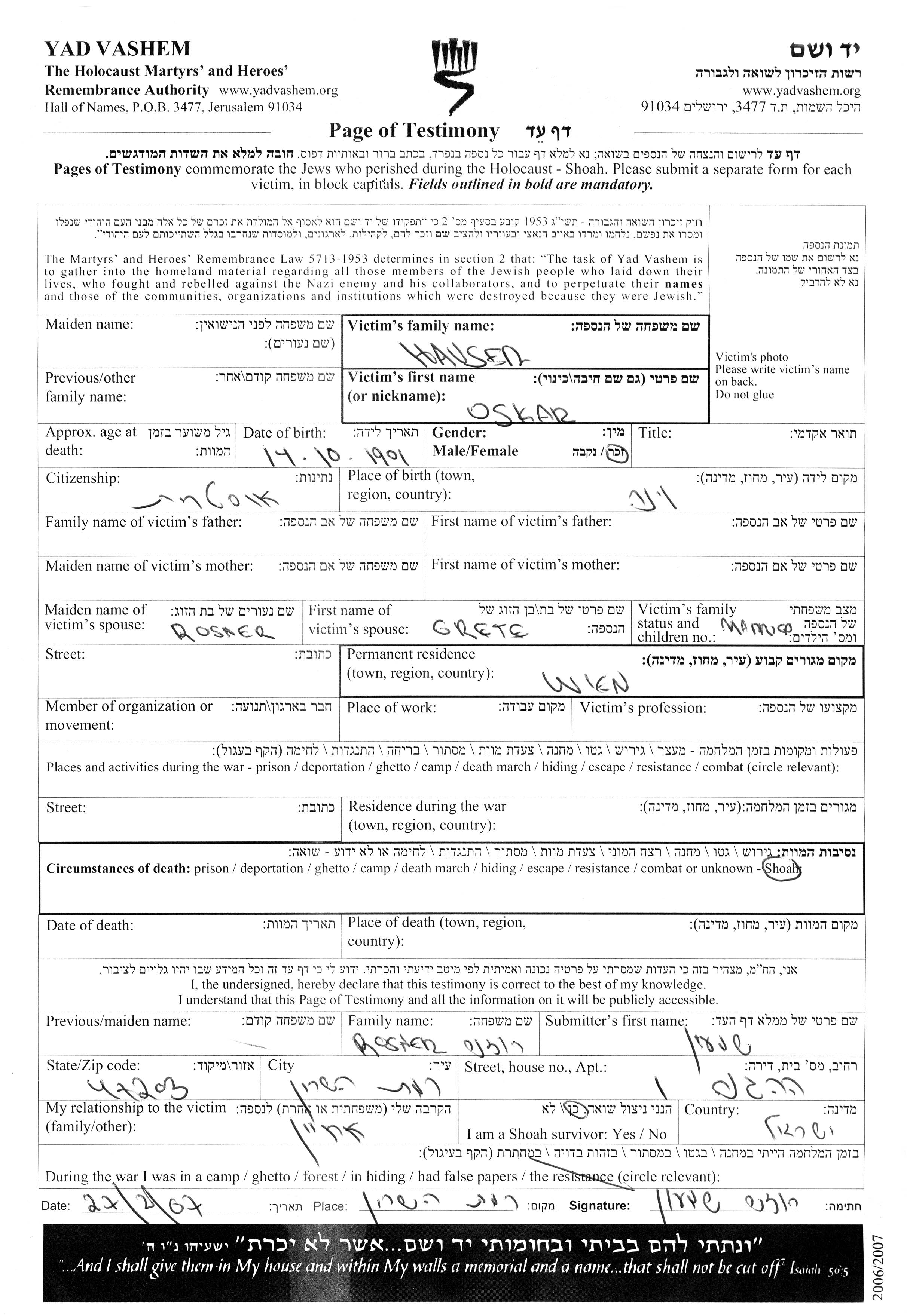 Yad Vashem - Pages of Testimony Names Memorial Collection