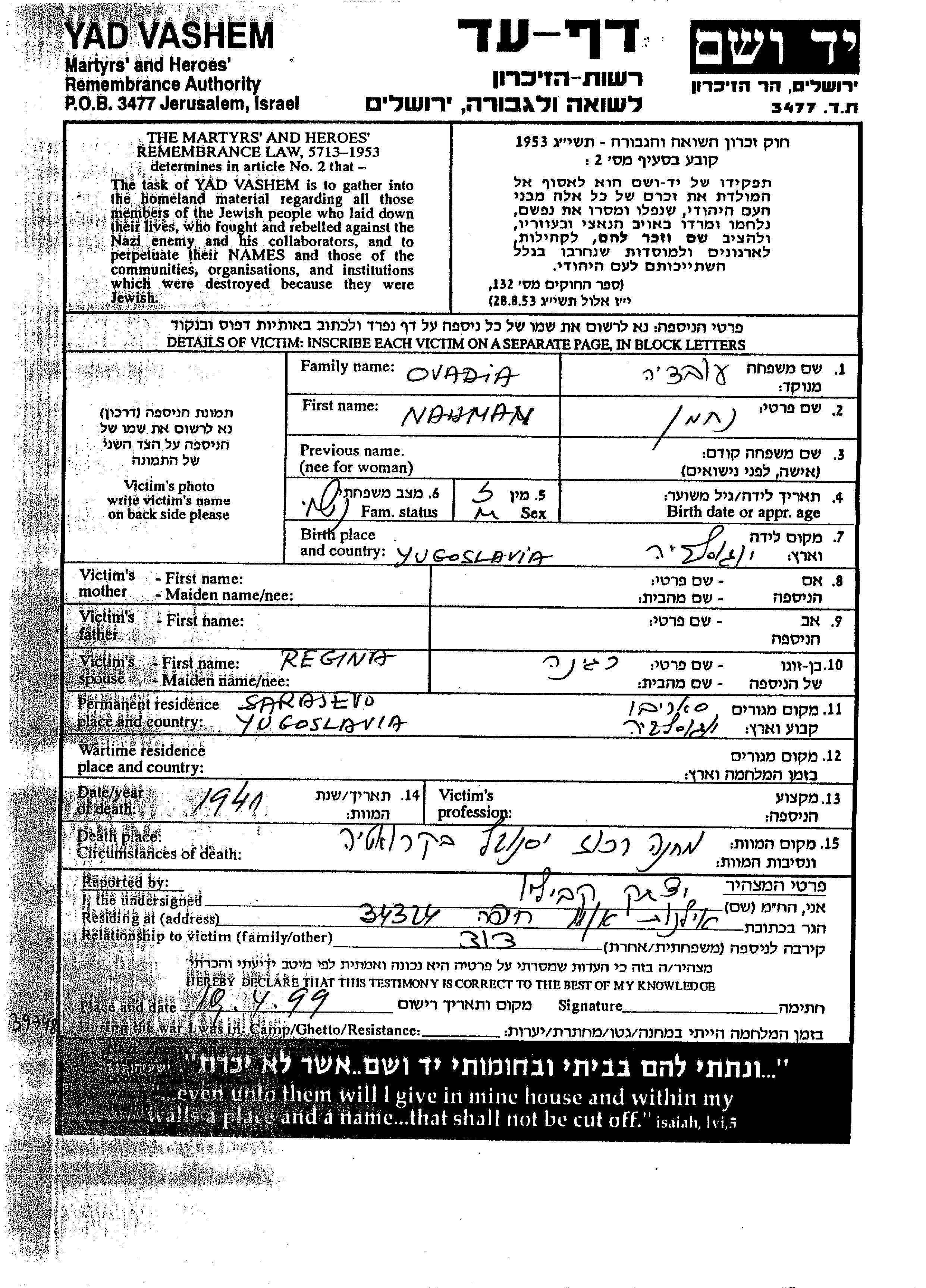 Ovadia Nahman Sarajevo, Yugoslavie Feuille de témoignage