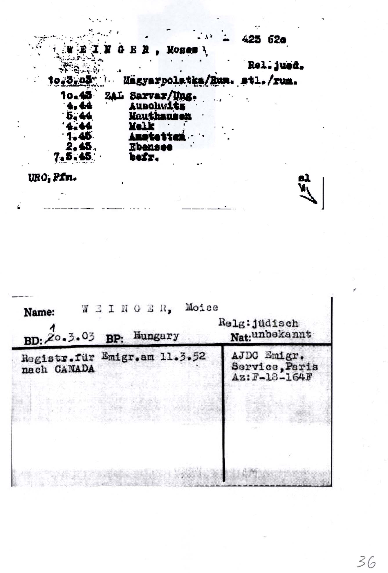 Moishe Weinger est né à Magyarpalatka, Roumanie en 1903. Avant la seconde guerre mondiale il vivait à Nagyrabe, Hongrie.