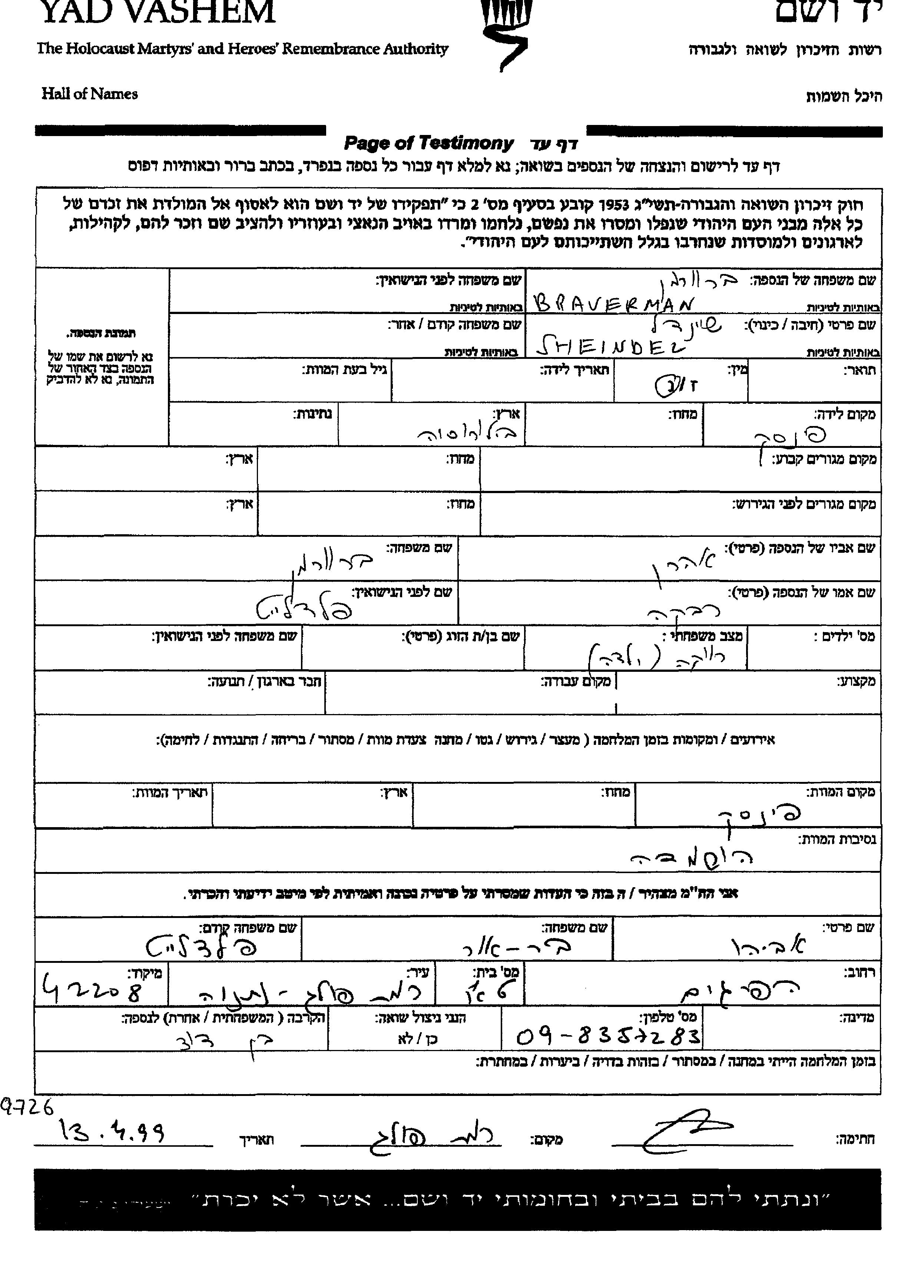 Braverman Sheindl endroit inconnu, Feuille de témoignage