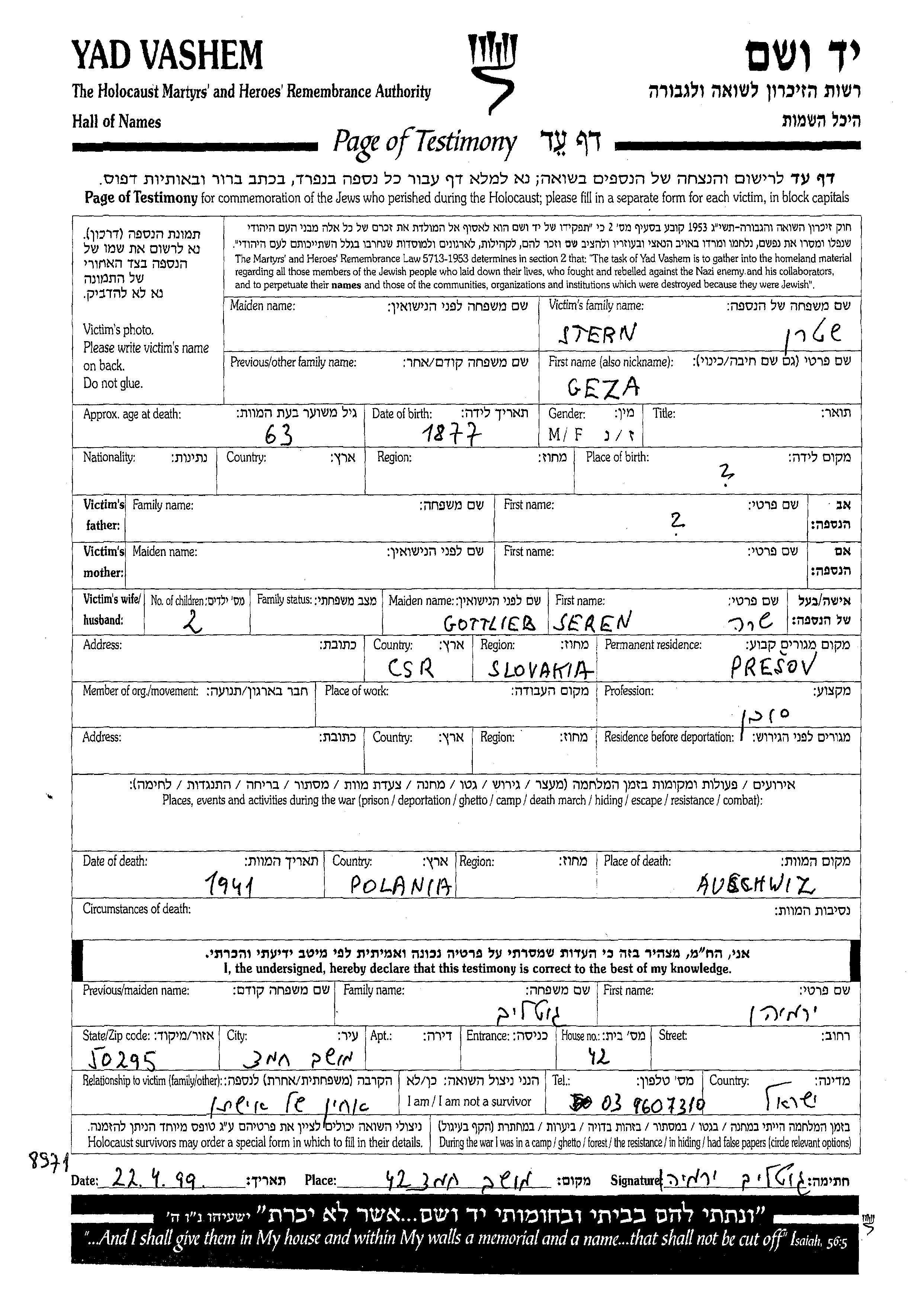 Geza a été assassiné pendant la Shoah. Lieu de la mort: Auschwitz, Pologne en 1941.