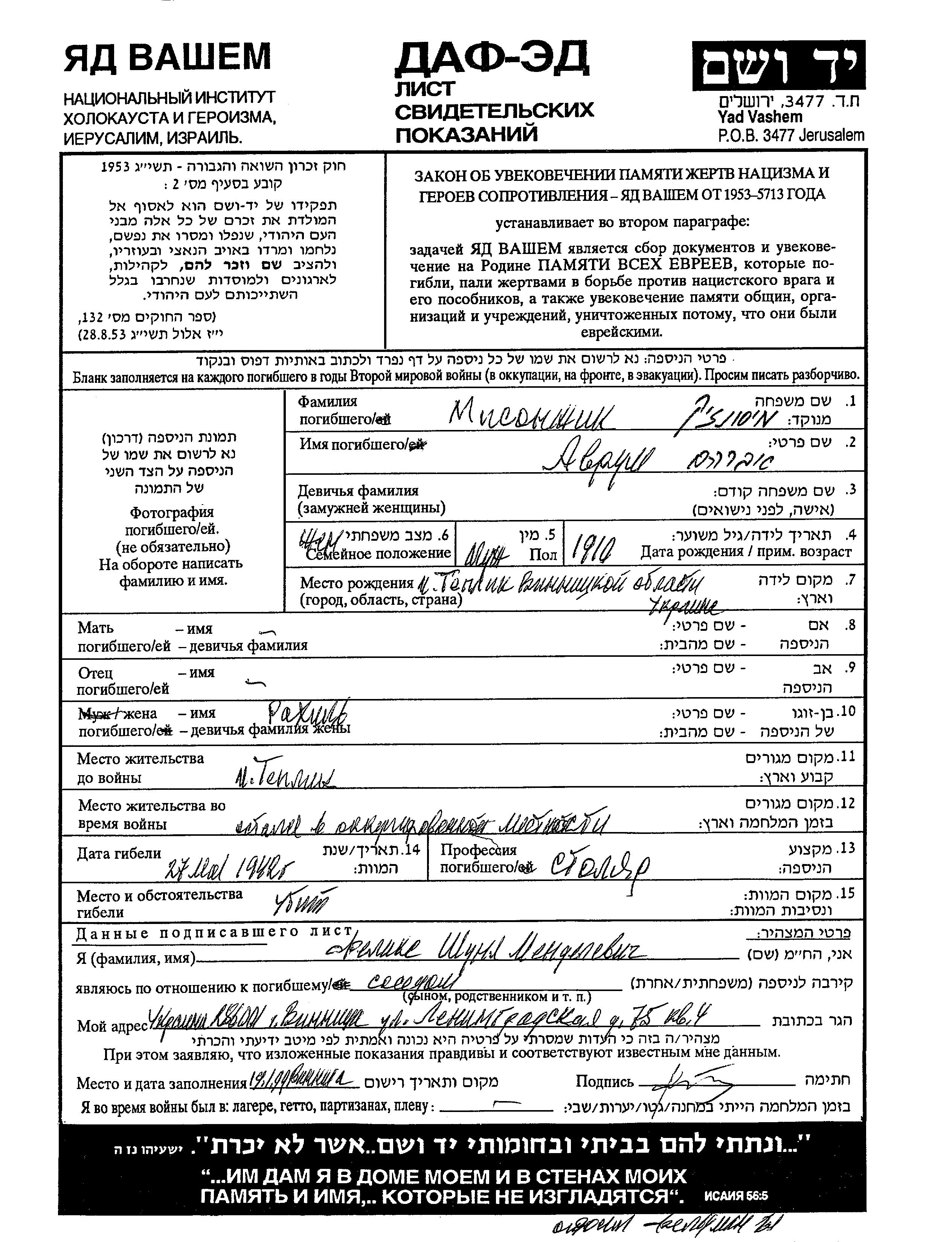 Misonzhik Avrum 1910 Teplik, Ukraine (URSS) Feuille de témoignage