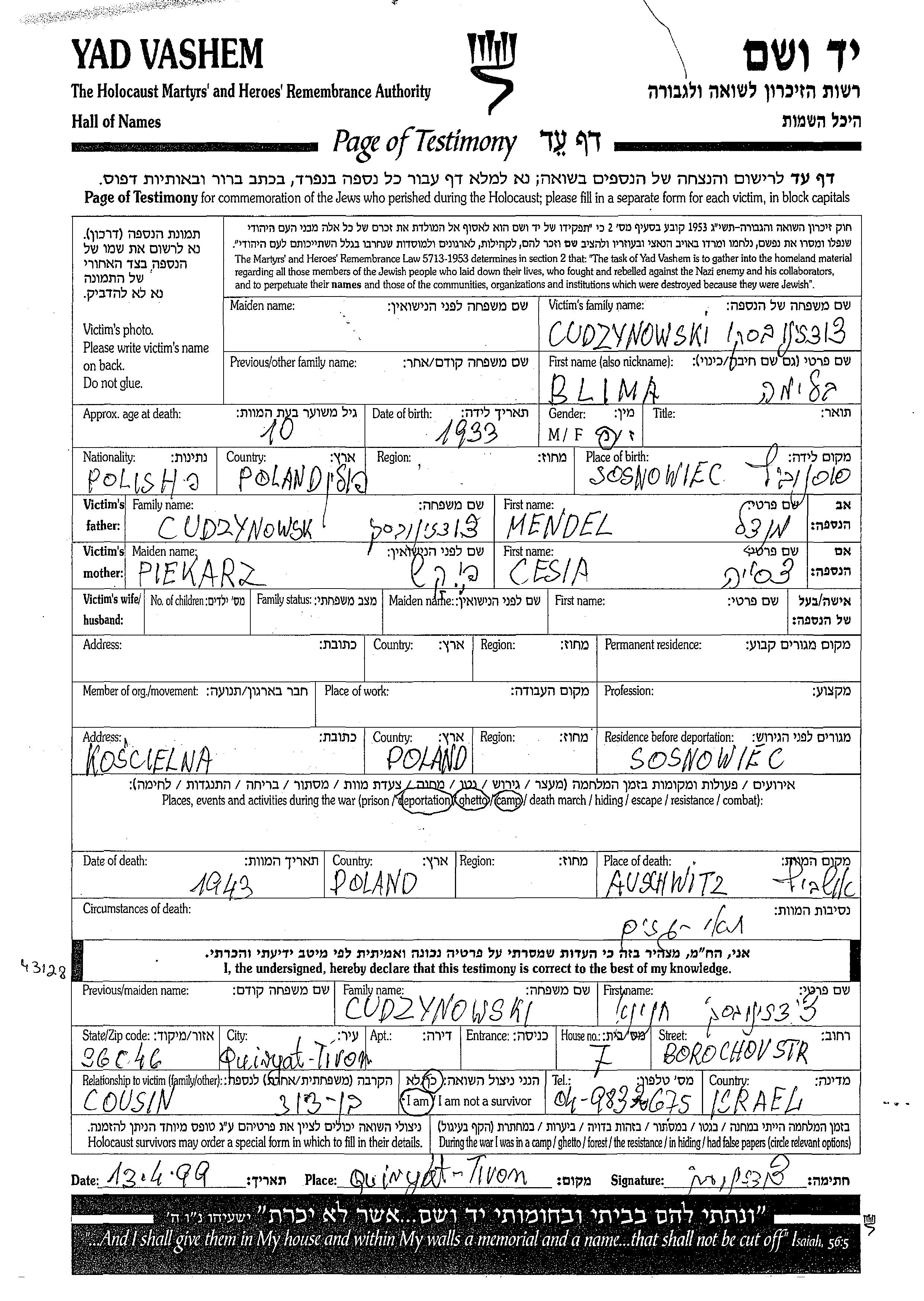 Cudzynowski Blima 1933 endroit inconnu, Feuille de témoignage