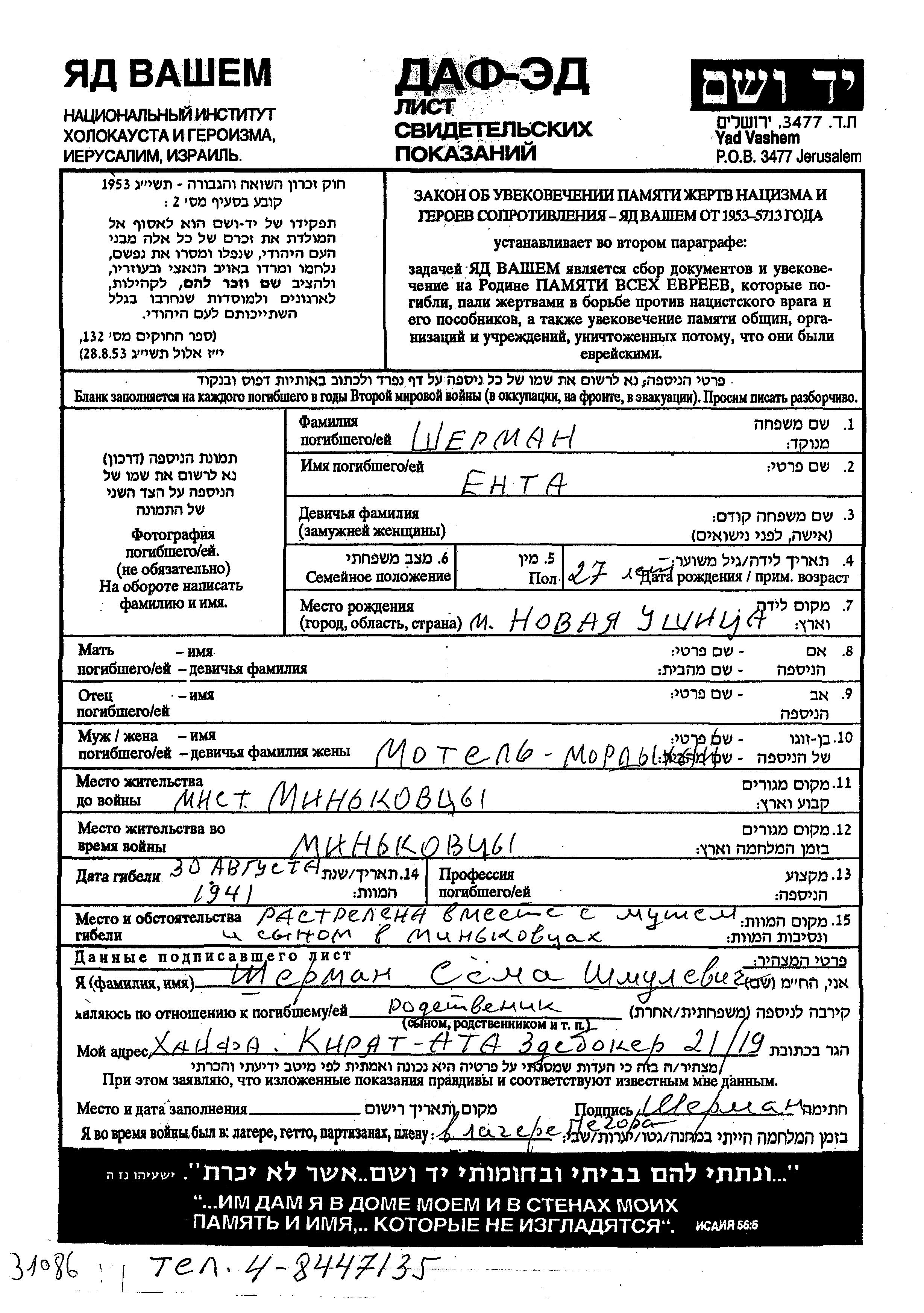 Yad Vashem - Pages of Testimony Names Memorial Collection