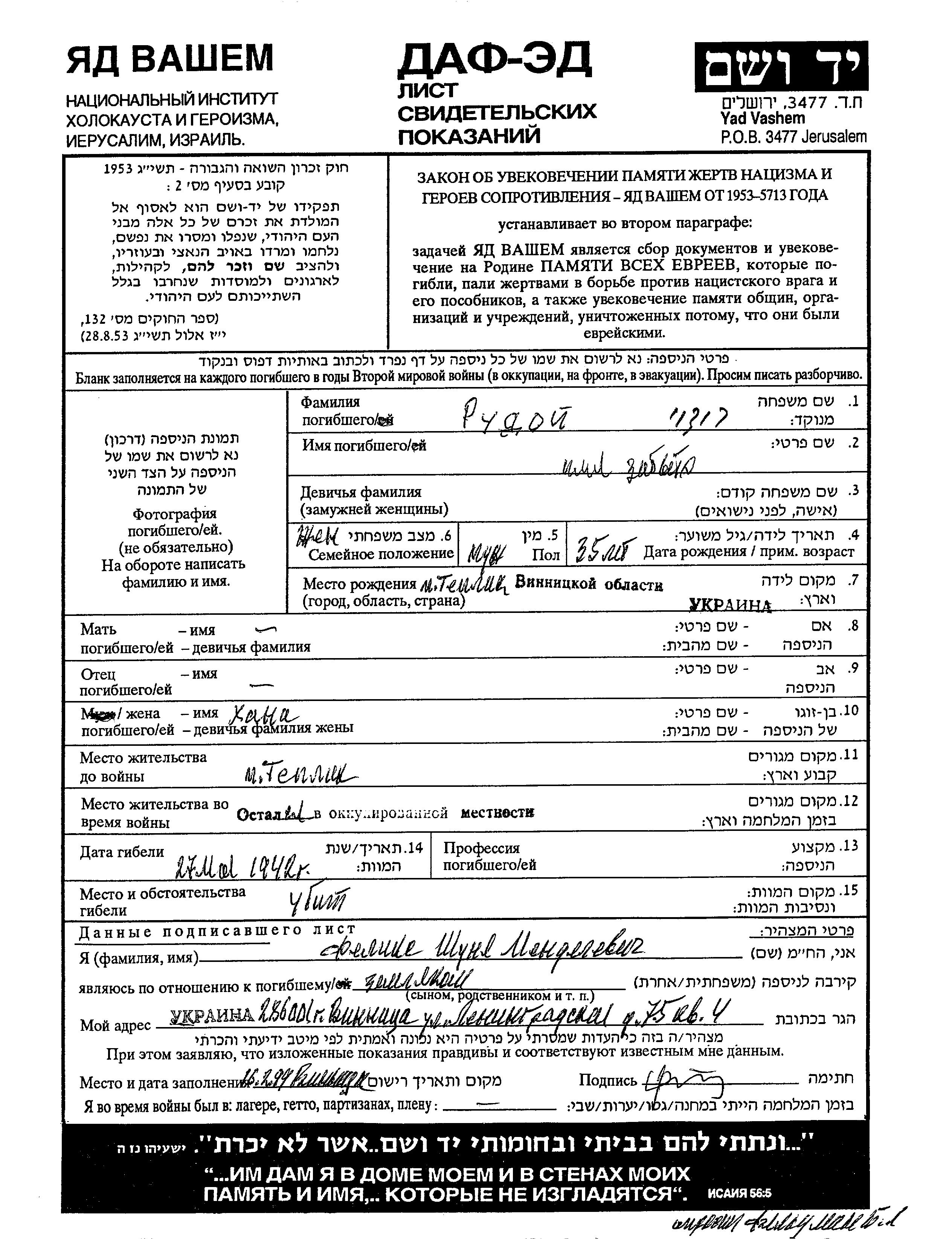 Rudoi prénom inconnu Teplik, Ukraine (URSS) Feuille de témoignage