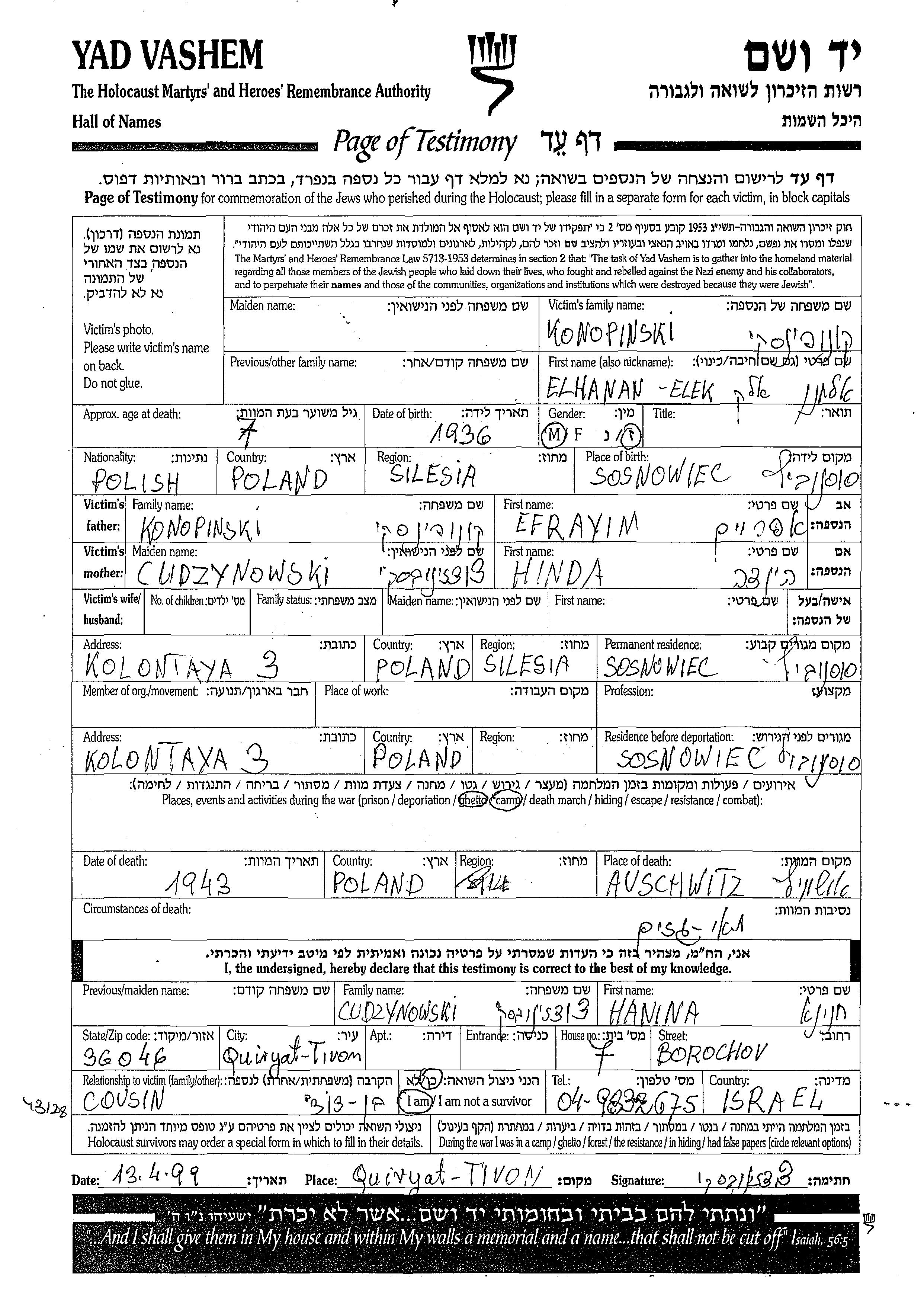 Konopinski Elhanan Alek 1936 Sosnowiec, Pologne Feuille de témoignage