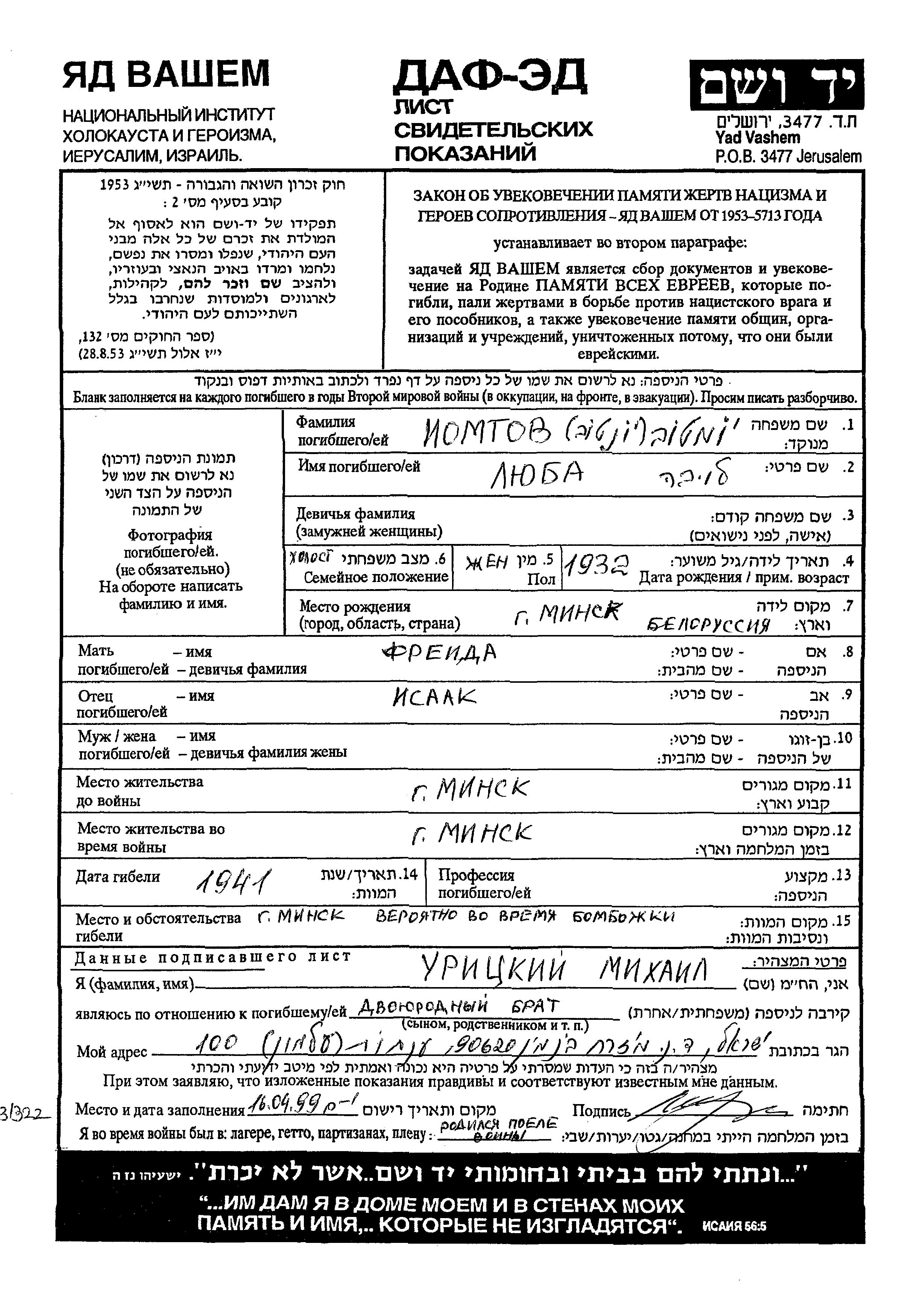 Iomtov Lyuba 1932 Minsk, Bélorussie (URSS) Feuille de témoignage