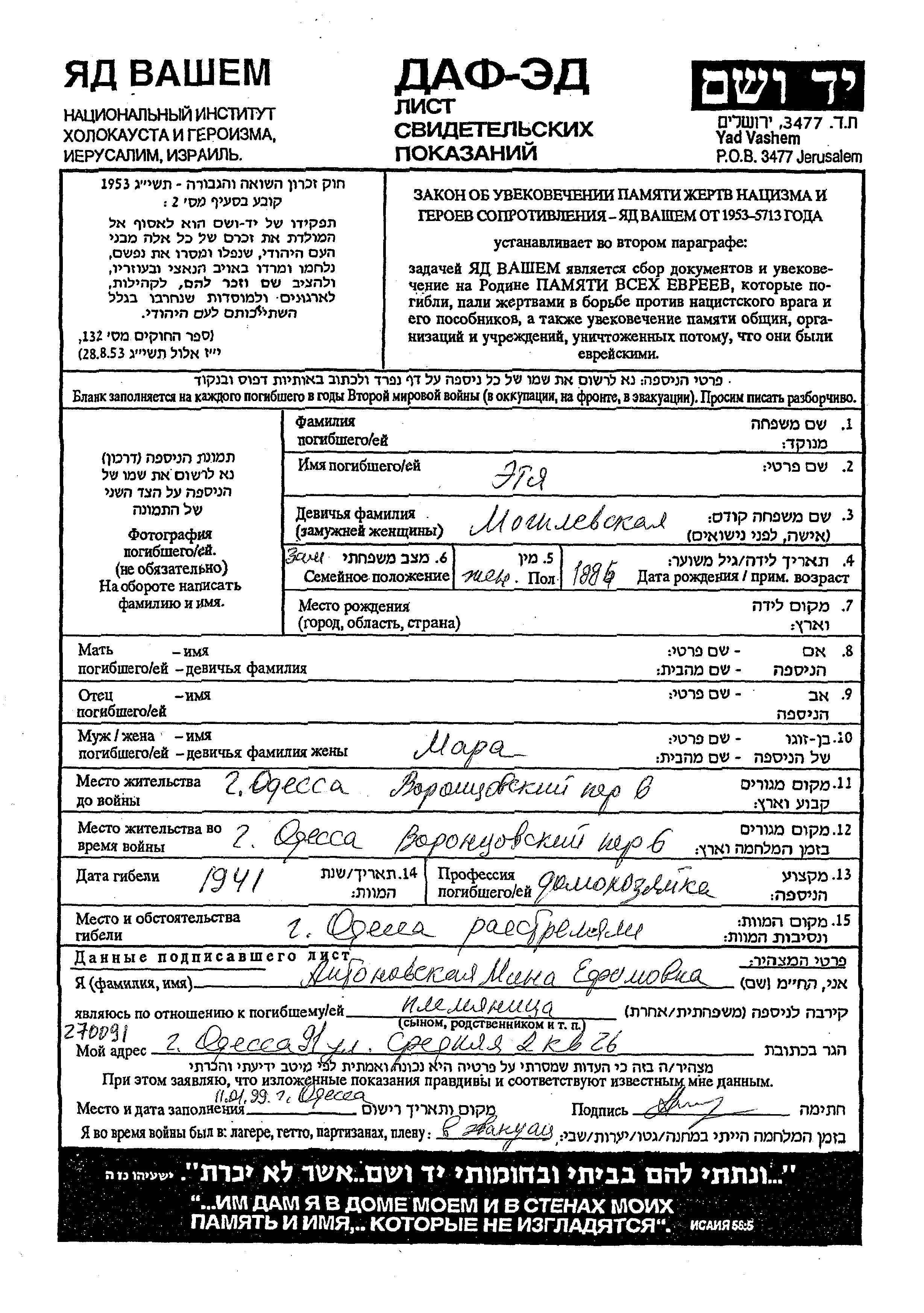 Etya nom inconnu née Mogilevski est née en 1886. Elle était Femme au foyer et Mariée à Mara. Avant la seconde guerre mondiale elle vivait à Odessa, Ukraine (URSS). Pendant la guerre, elle était à Odessa, Ukraine (URSS).