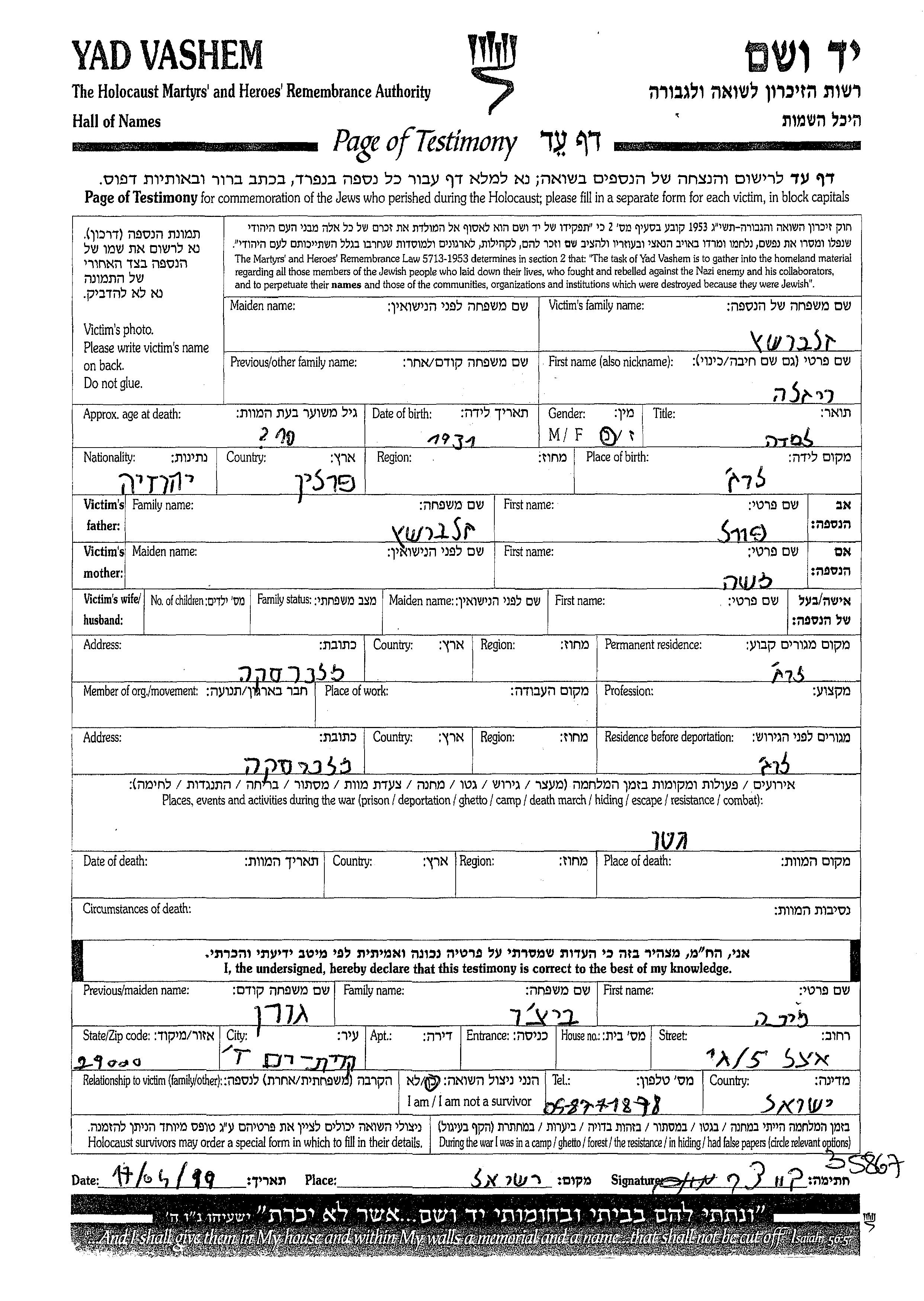 Yad Vashem - Pages of Testimony Names Memorial Collection