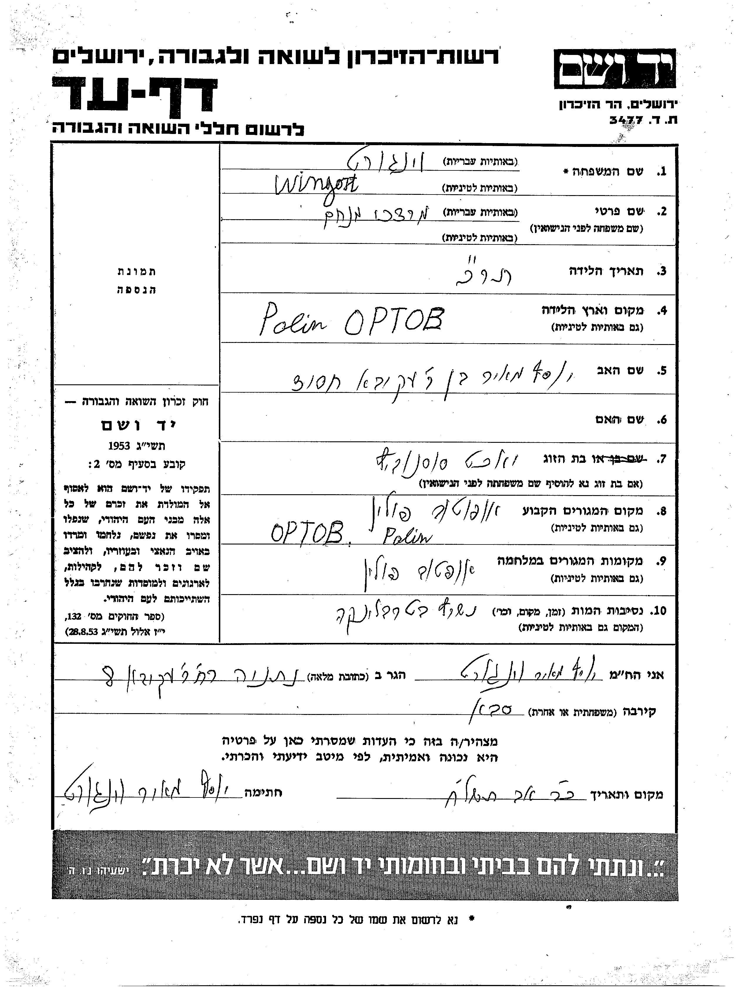 Wingort Mordekhai Menakhem Opotov, Pologne Feuille de témoignage