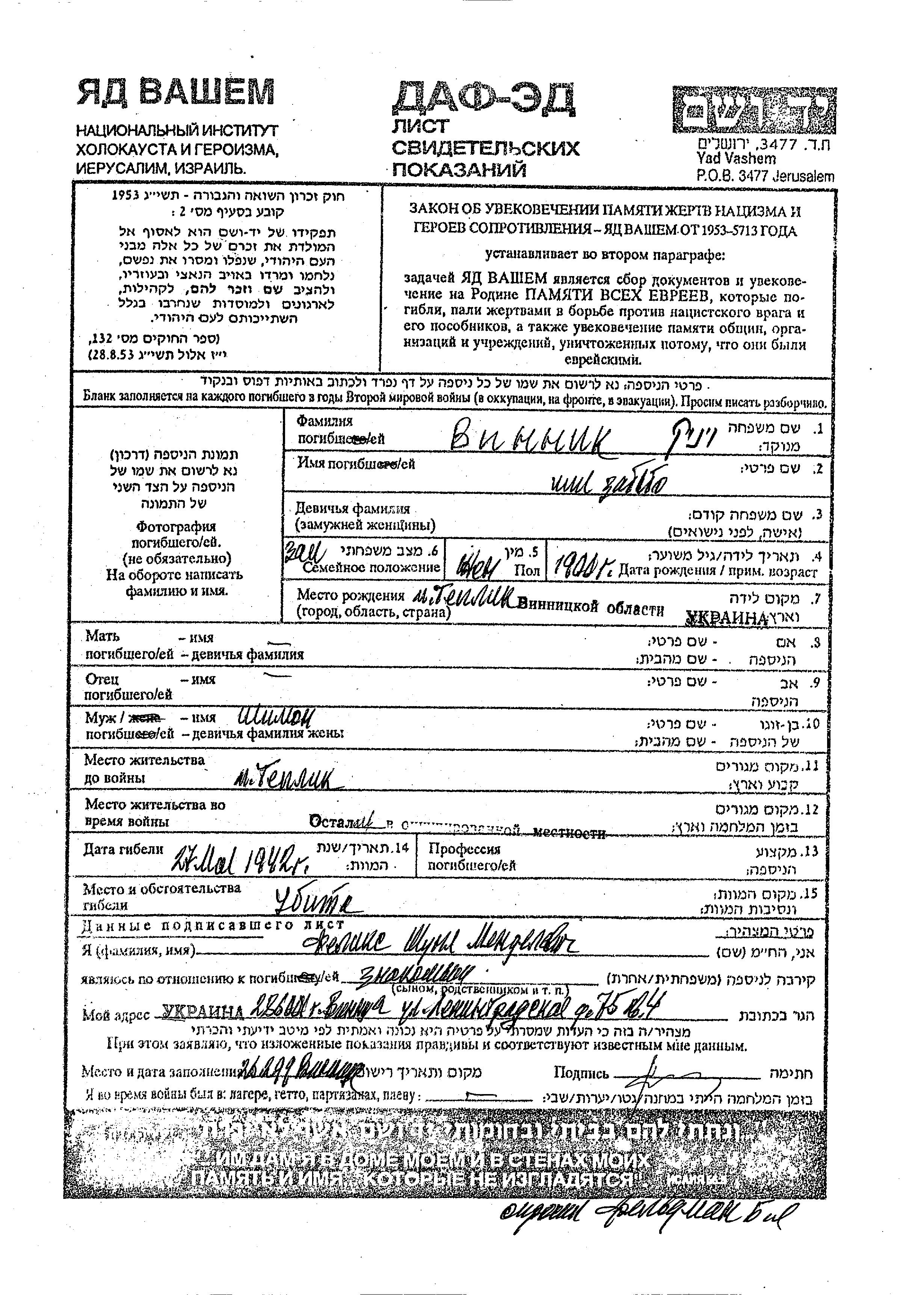 Vinnik prénom inconnu 1901 Teplik, Ukraine (URSS) Feuille de témoignage
