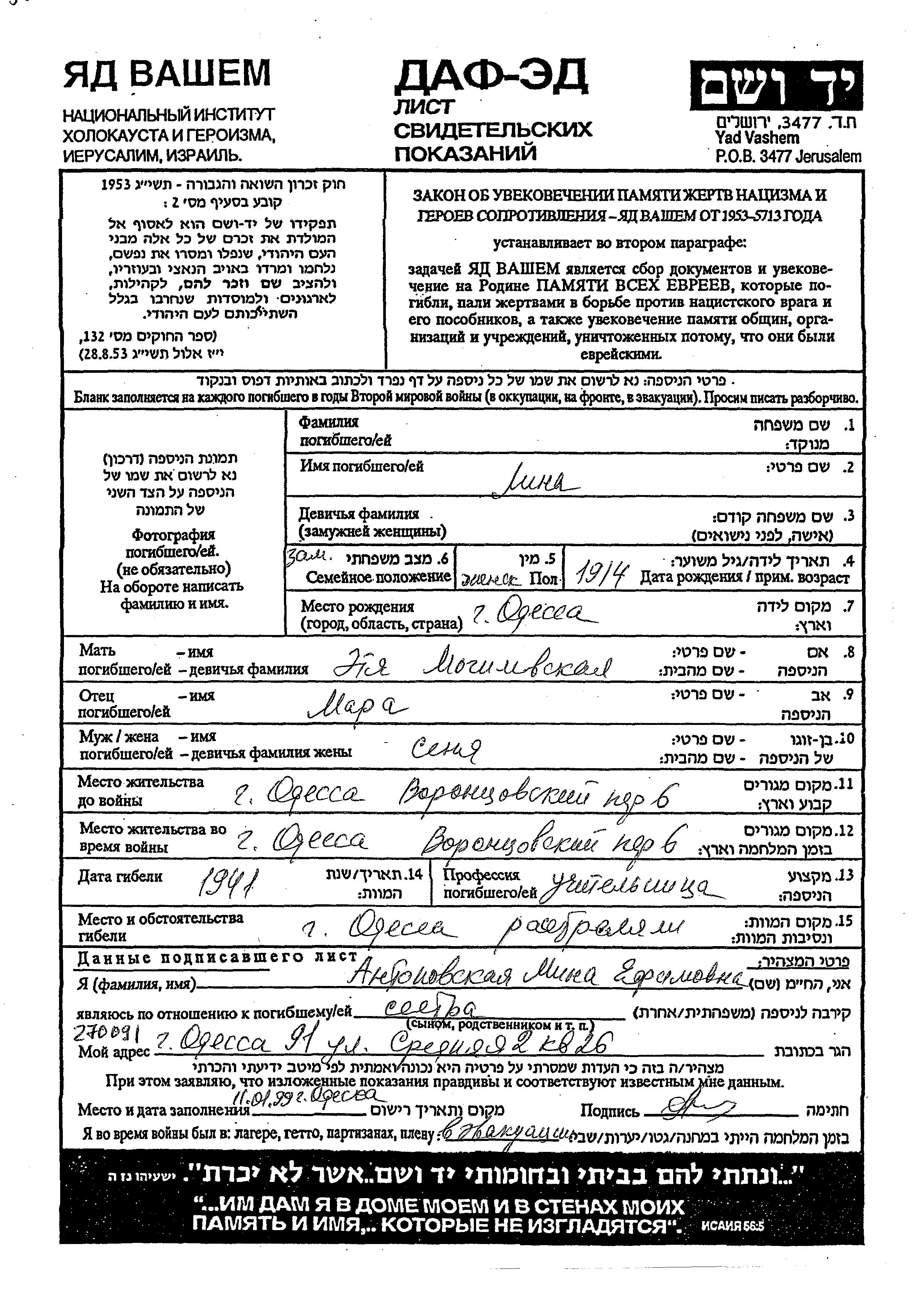 nom inconnu Lina 1914 Odessa, Ukraine (URSS) Feuille de témoignage