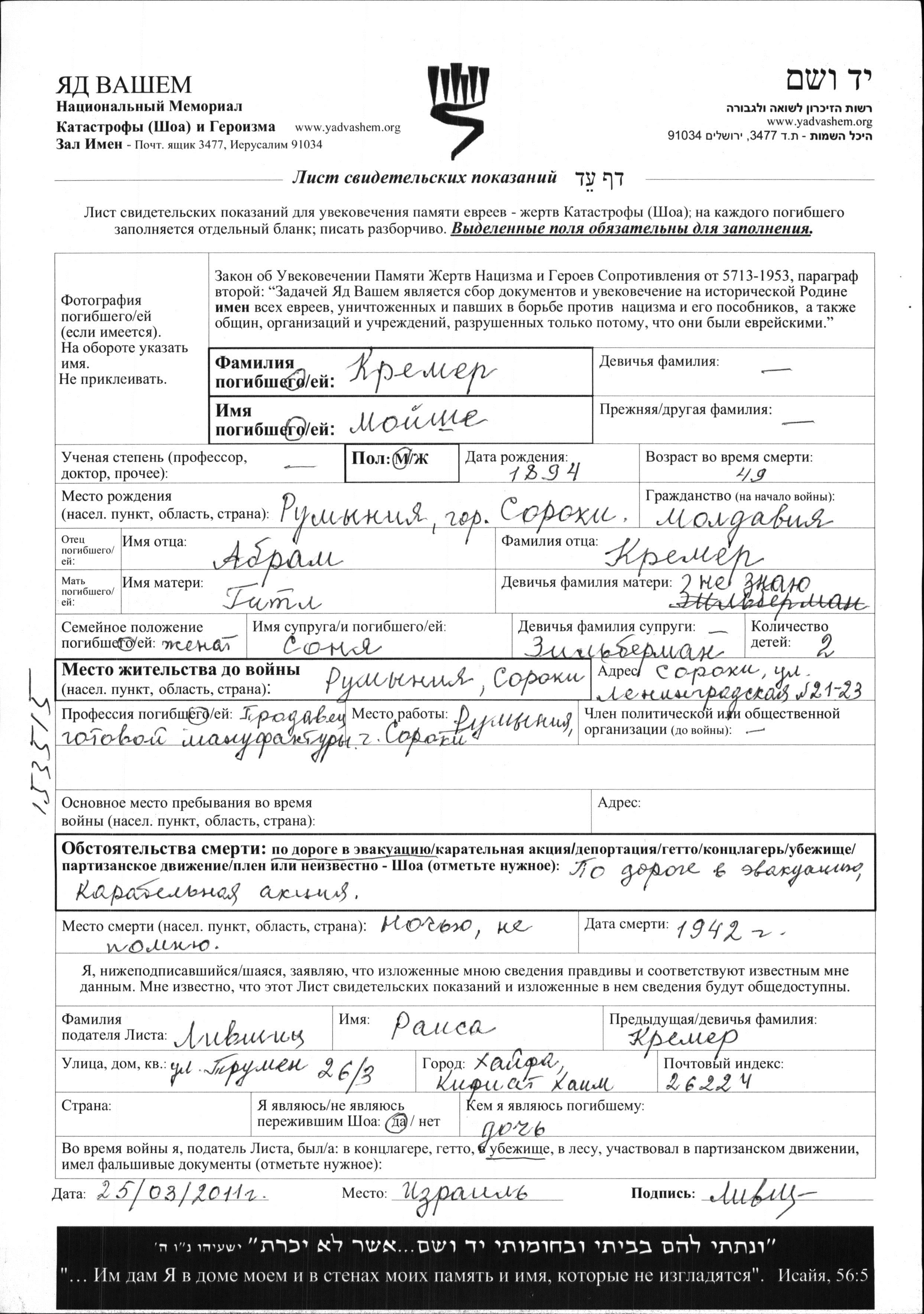 Kremer Moishe 1894 Soroki, Roumanie Feuille de témoignage