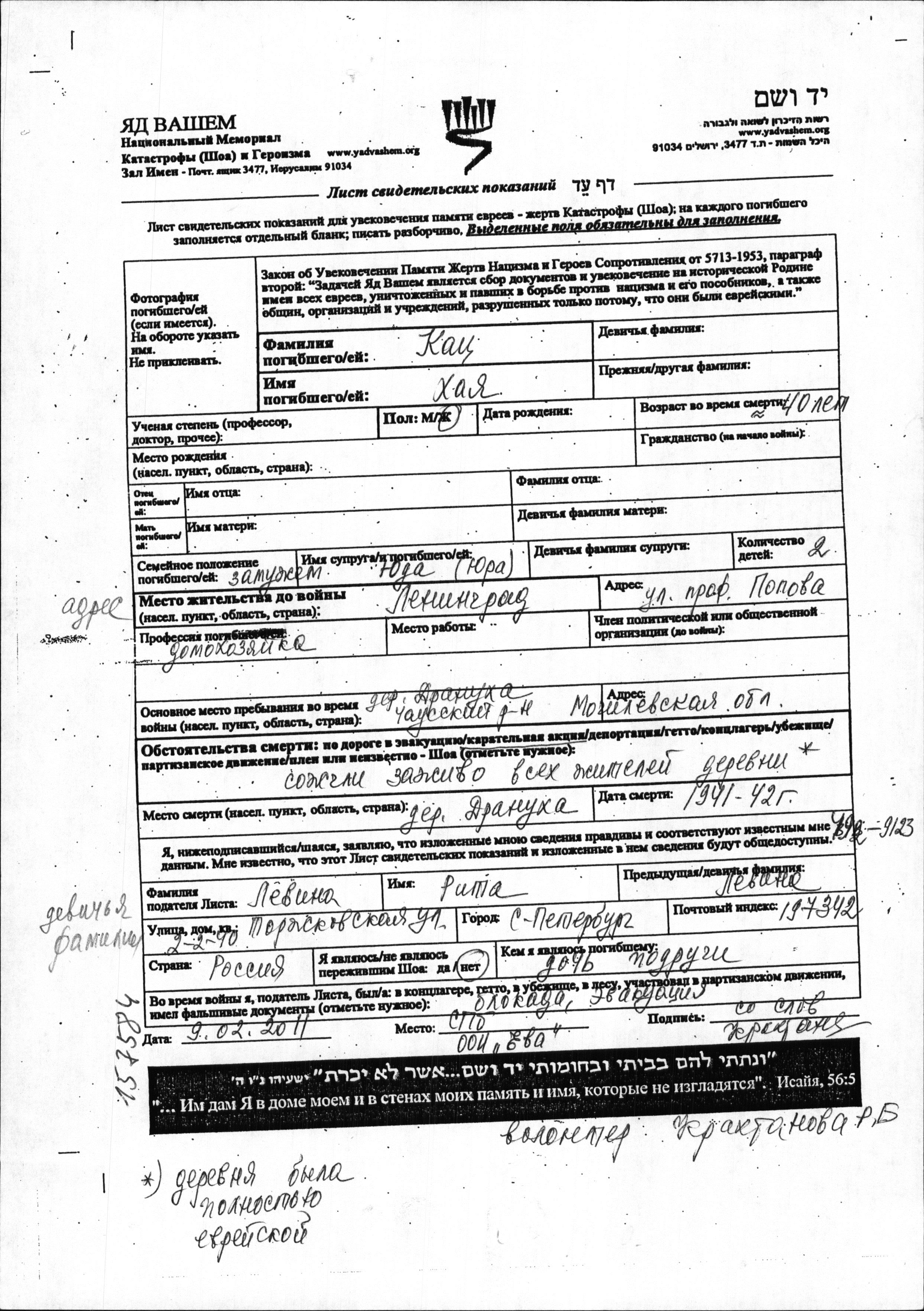 Katz Khaya Leningrad, Russie (URSS) Feuille de témoignage