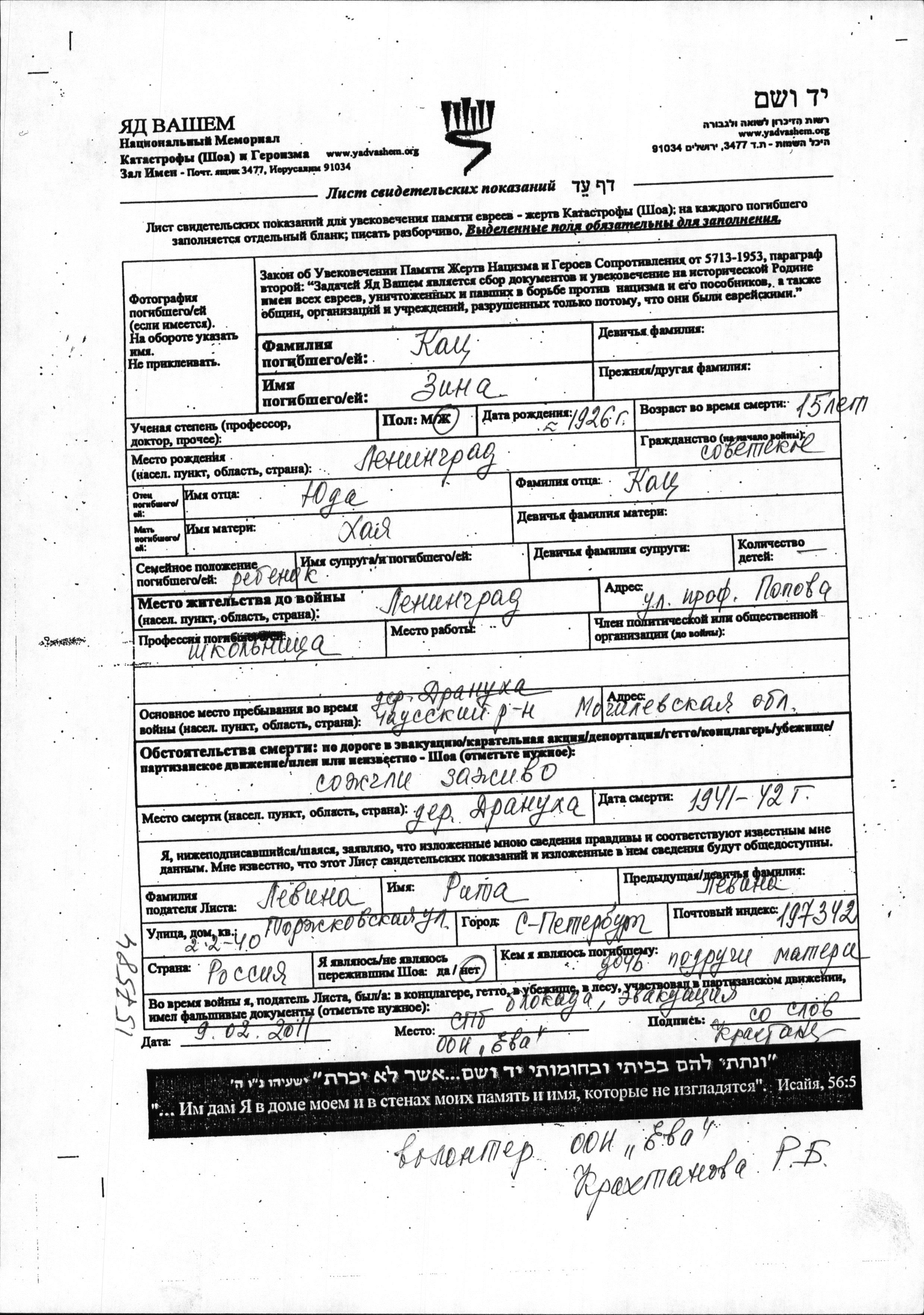 Katz Zina 1926 Leningrad, Russie (URSS) Feuille de témoignage