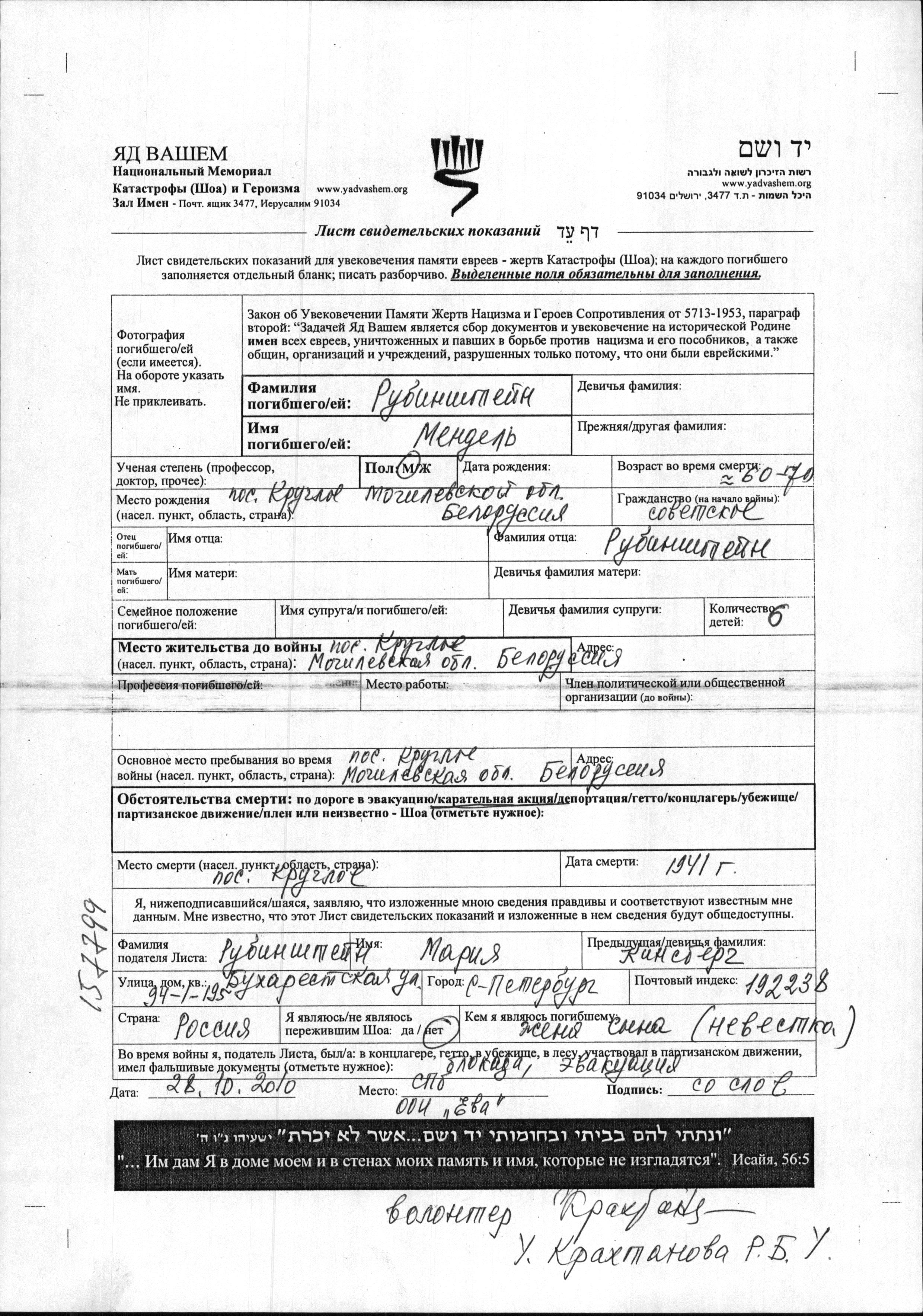 Rubinshteyn Mendel Krugloye, Bélorussie (URSS) Feuille de témoignage
