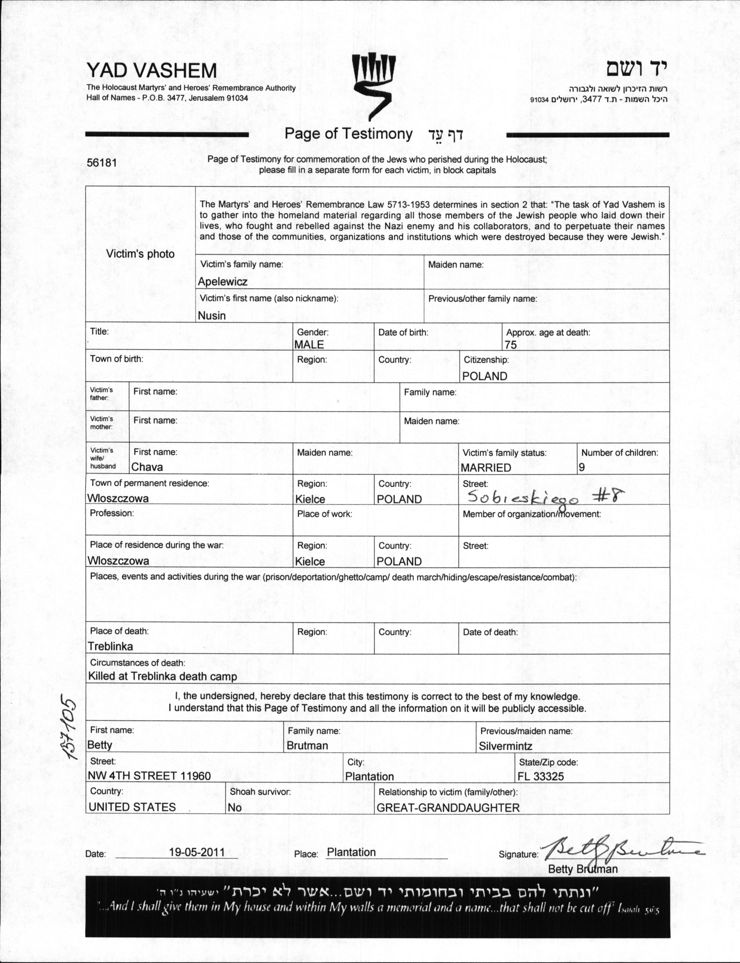 Nusin Apelewicz. Il était Mariée à Chava. Avant la seconde guerre mondiale il vivait à Wloszczowa, Pologne. Au cours de la guerre, il était à Wloszczowa, Pologne.