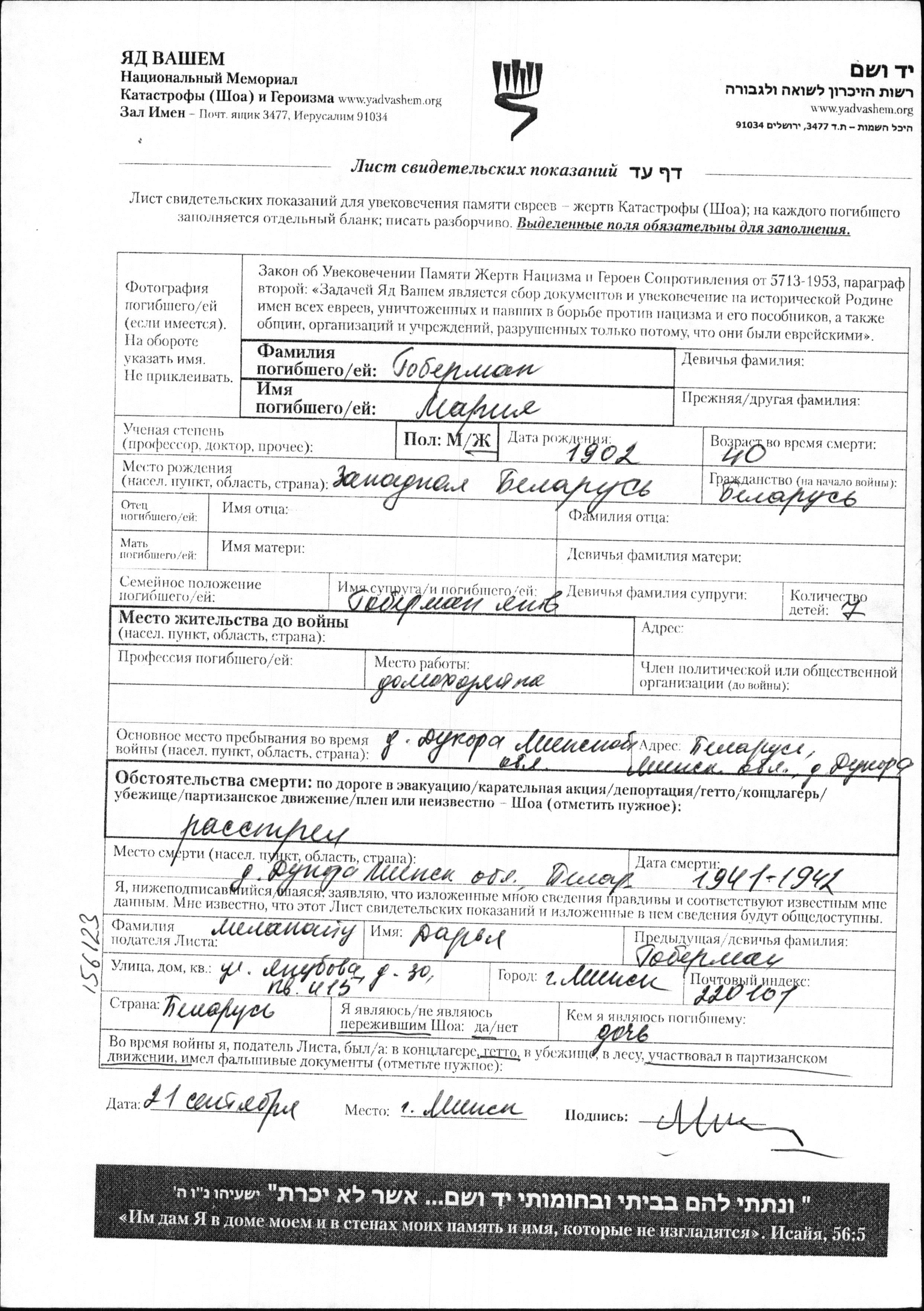 Goberman Maria 1902 Dukora, Bélorussie (URSS) Feuille de témoignage