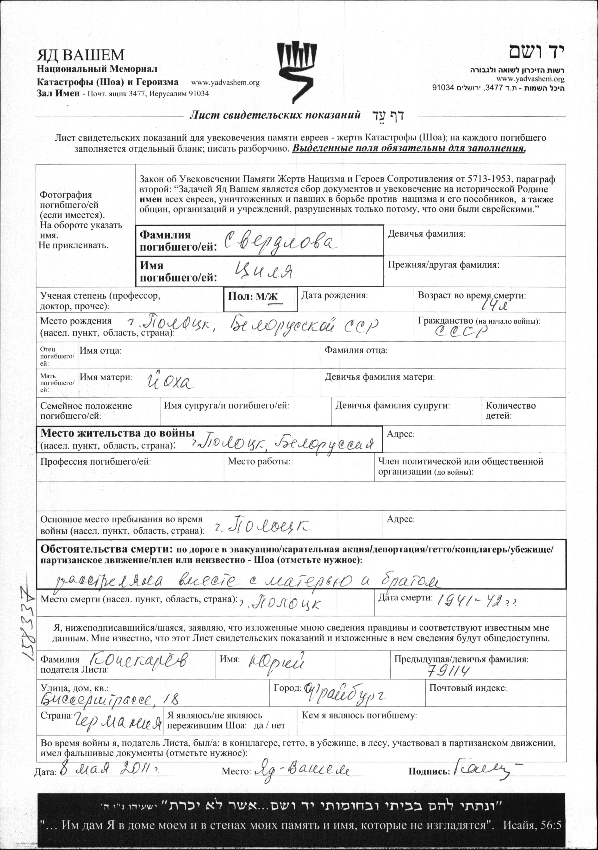 Tzilya Sverdlova est née à Polotsk, Bélorussie (URSS), fille de Yokha. Elle était Adolescent. Avant la seconde guerre mondiale elle vivait à Polotsk, Bélorussie (URSS). Pendant la guerre, elle était à Polotsk, Bélorussie (URSS).