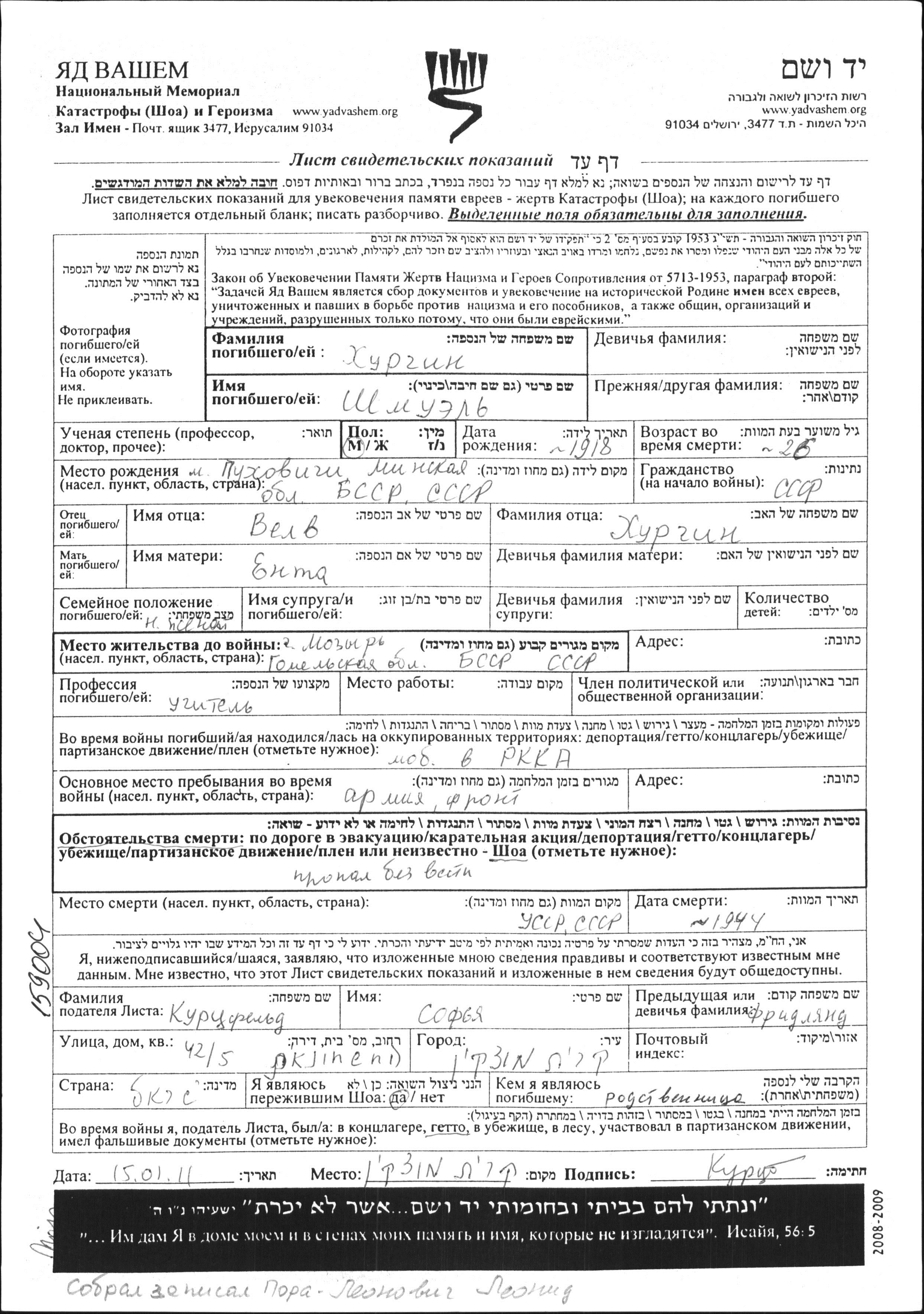 Khurgin Shmuel 1918 Mozyr, Bélorussie (URSS) Feuille de témoignage
