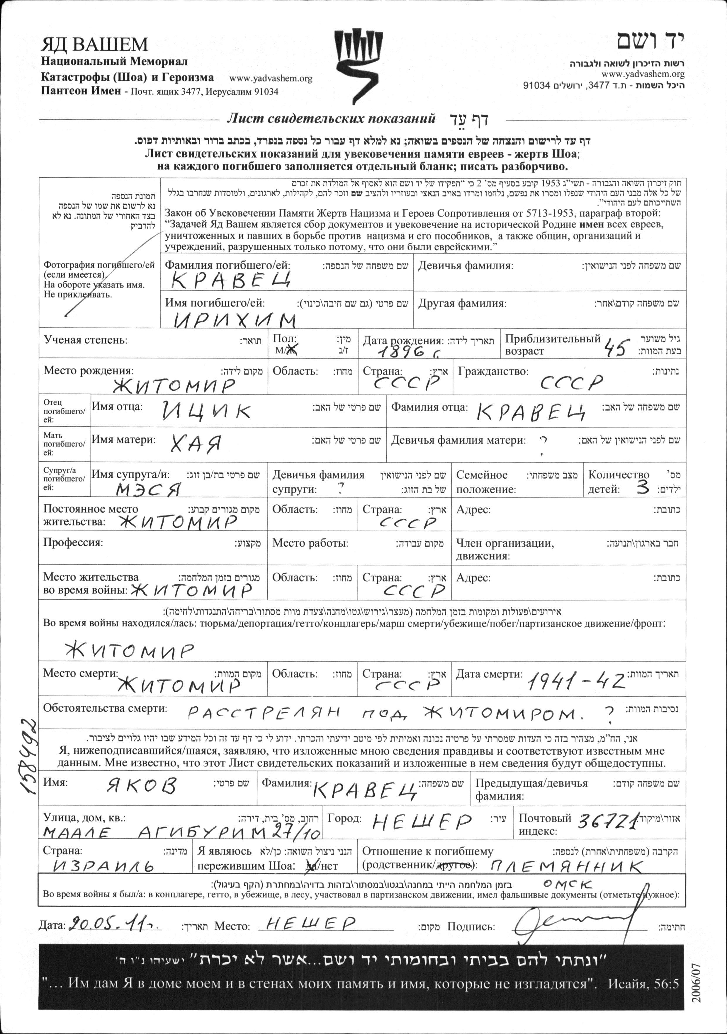 Kravetz Irikhim 1896 Zhitomir, Ukraine (URSS) Feuille de témoignage