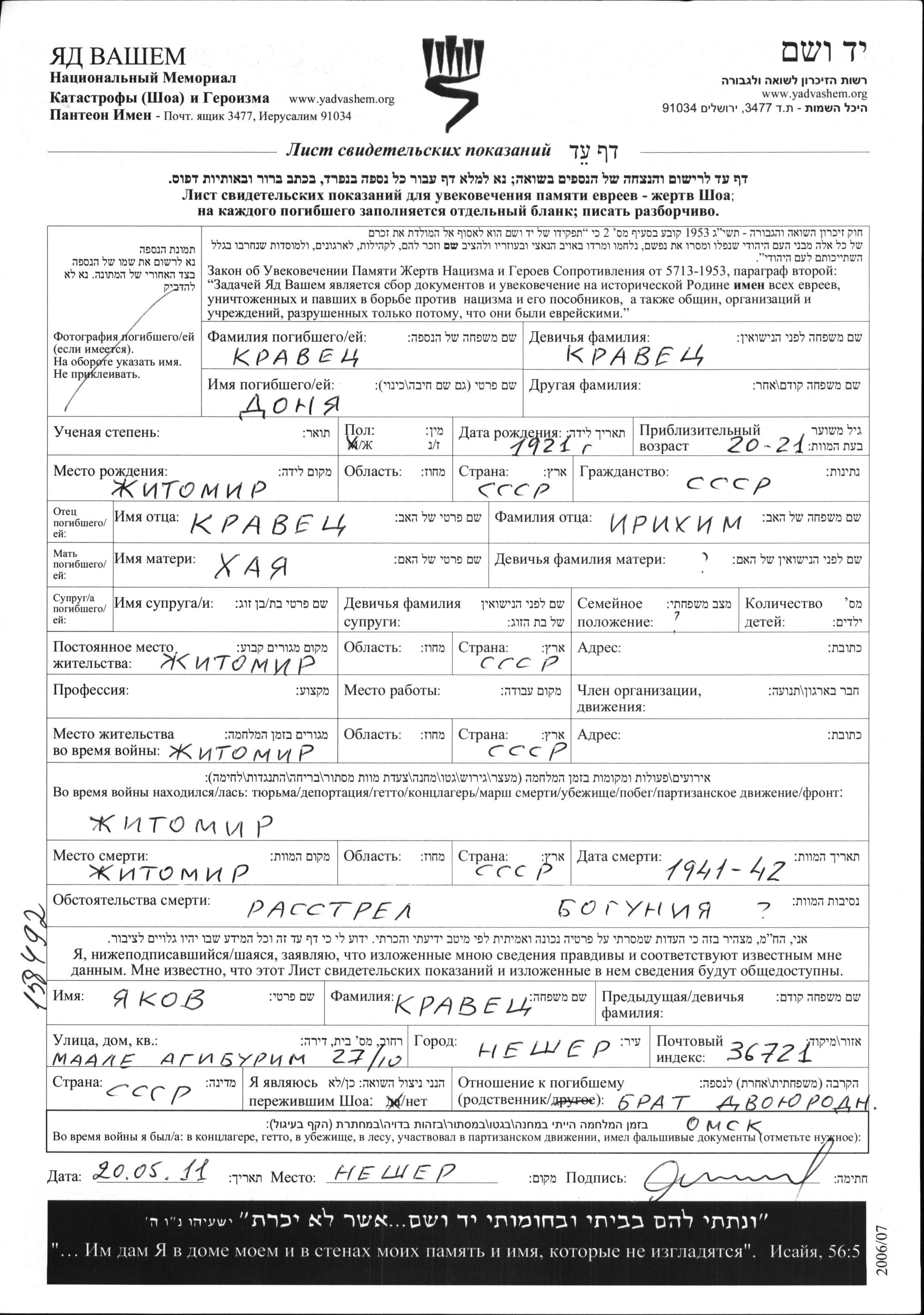 Kravetz Donya 1921 Zhitomir, Ukraine (URSS) Feuille de témoignage