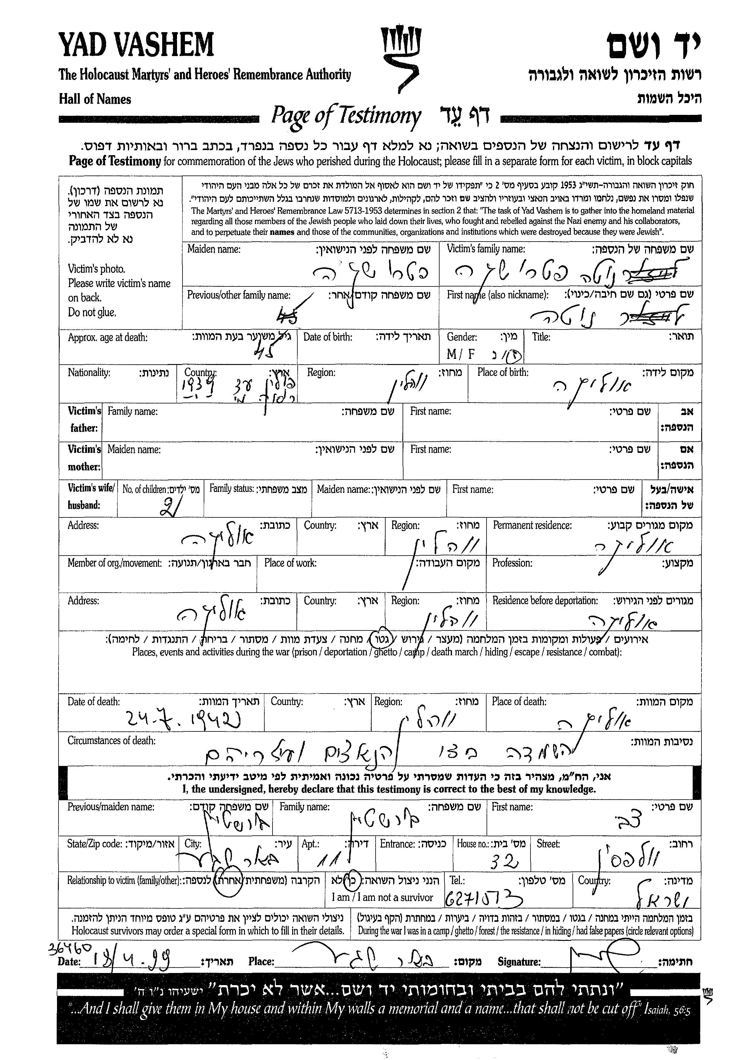 Yad Vashem - Pages of Testimony Names Memorial Collection