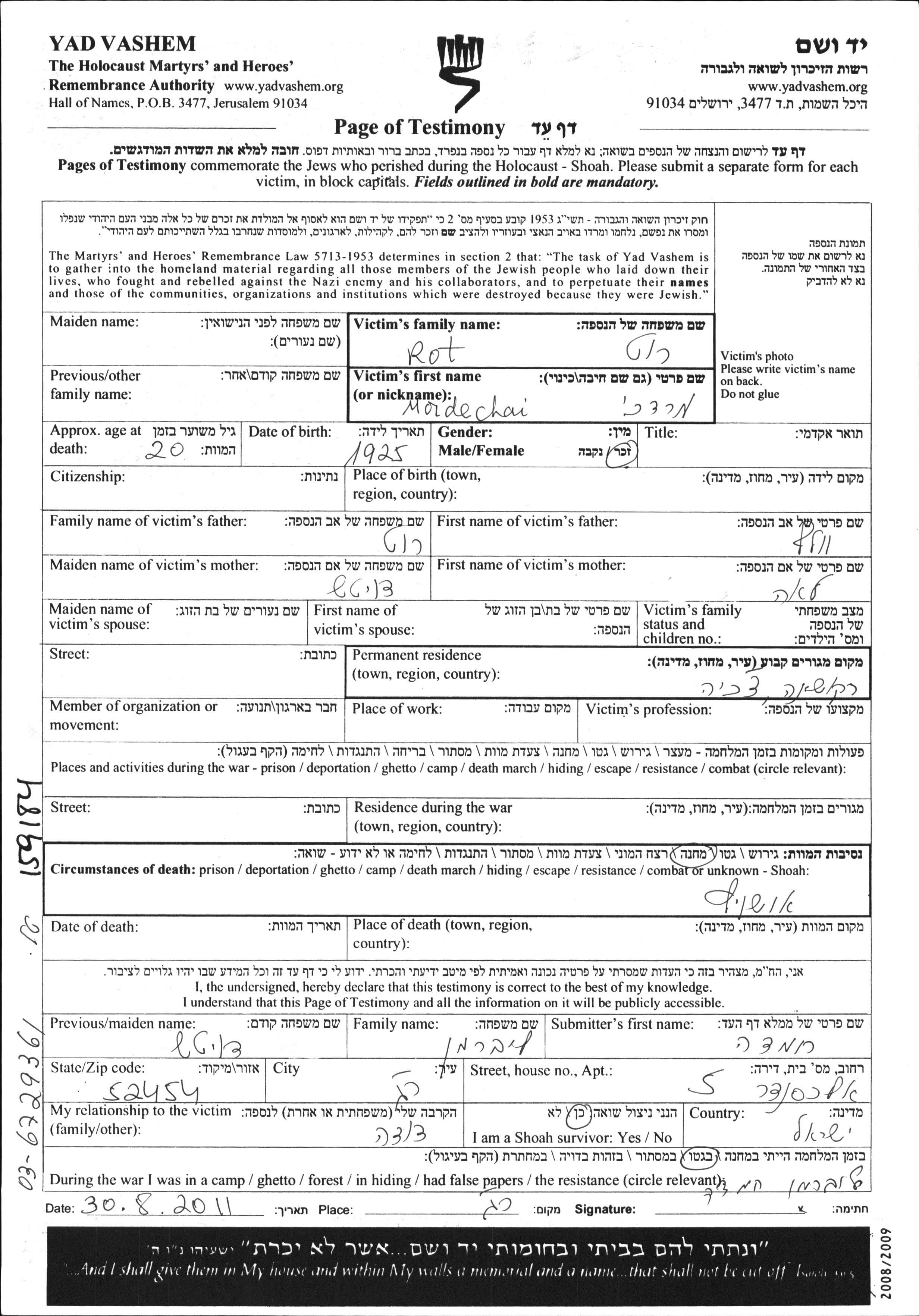 Mordechai a été assassiné pendant la Shoah. Lieu de la mort: Auschwitz, Pologne.