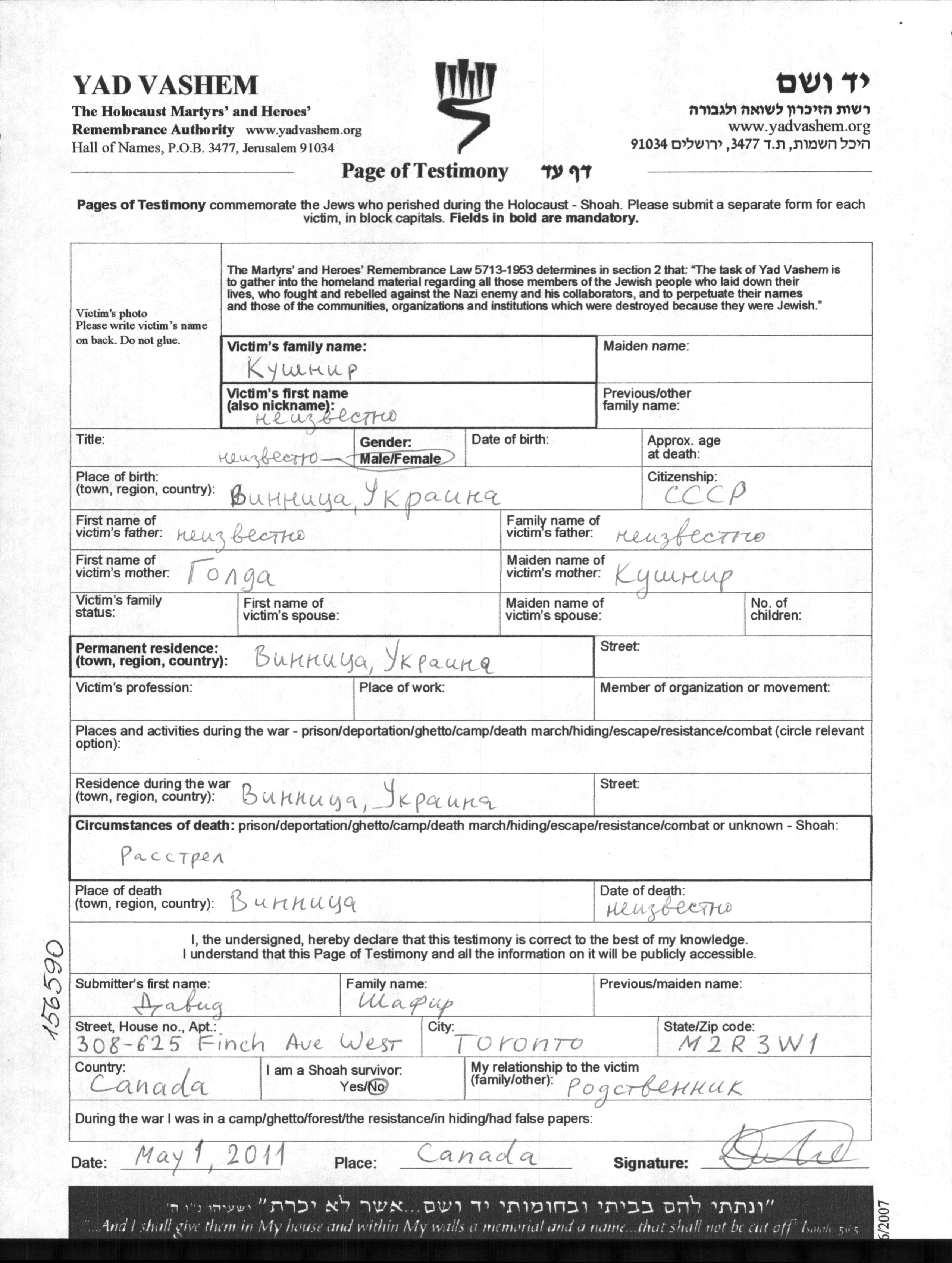 Kushnir prénom inconnu Vinnitsa, Ukraine (URSS) Feuille de témoignage