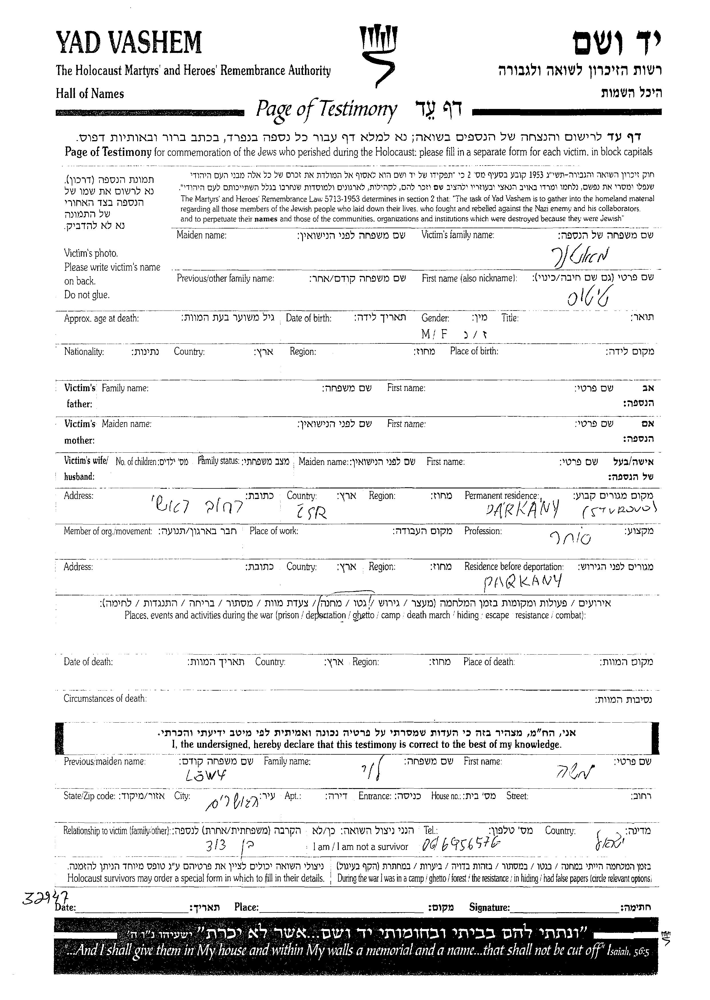 Yad Vashem - Pages of Testimony Names Memorial Collection