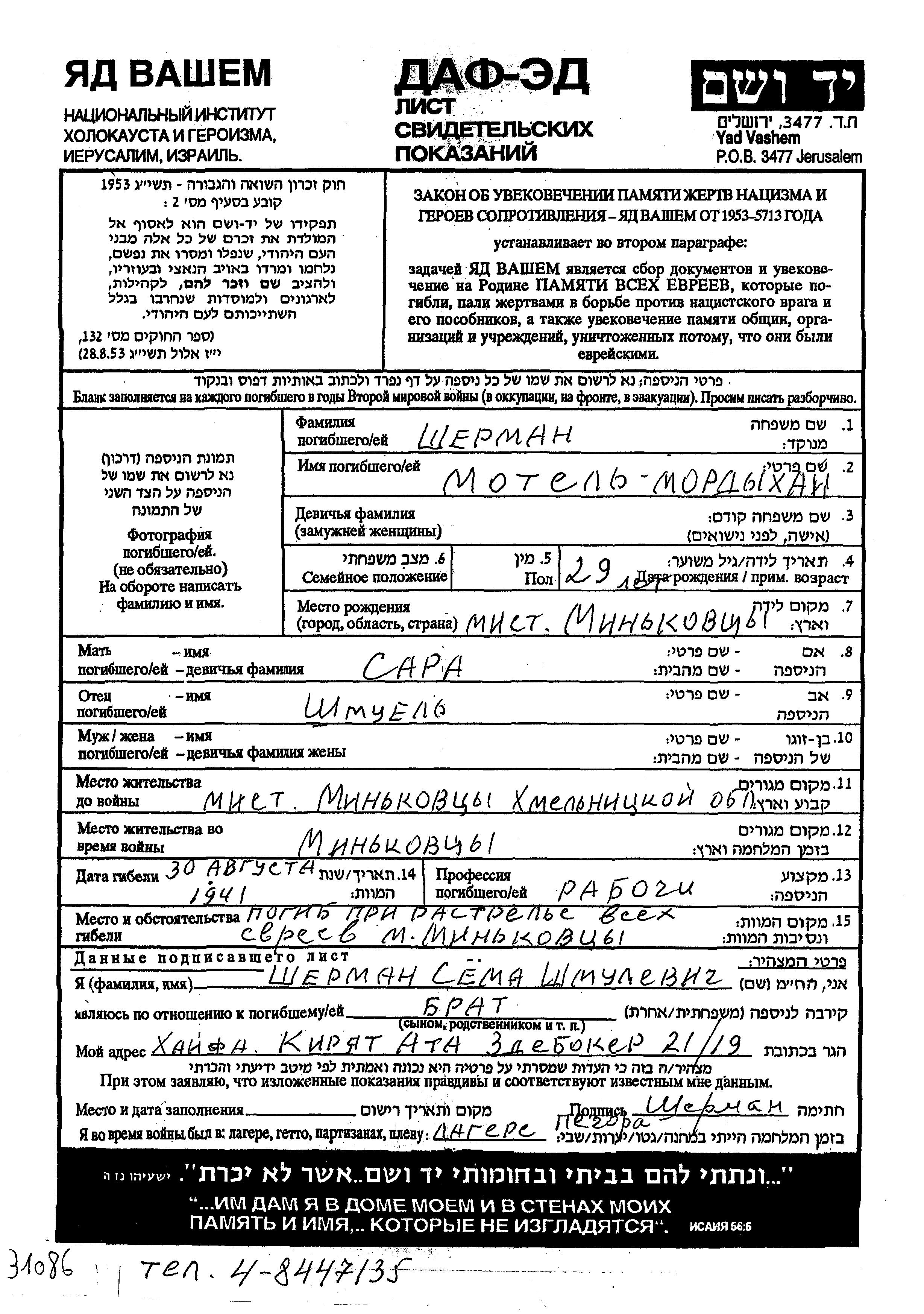 Sherman Motel Mordichai Minkovitz, Ukraine (URSS) Feuille de témoignage