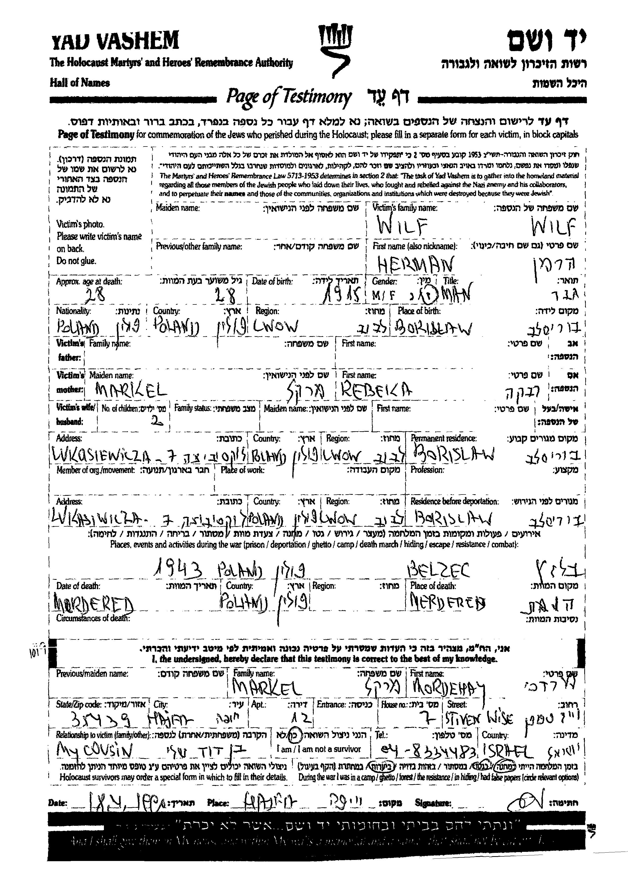 Wilf Herman 1915 Borislaw, Pologne Feuille de témoignage