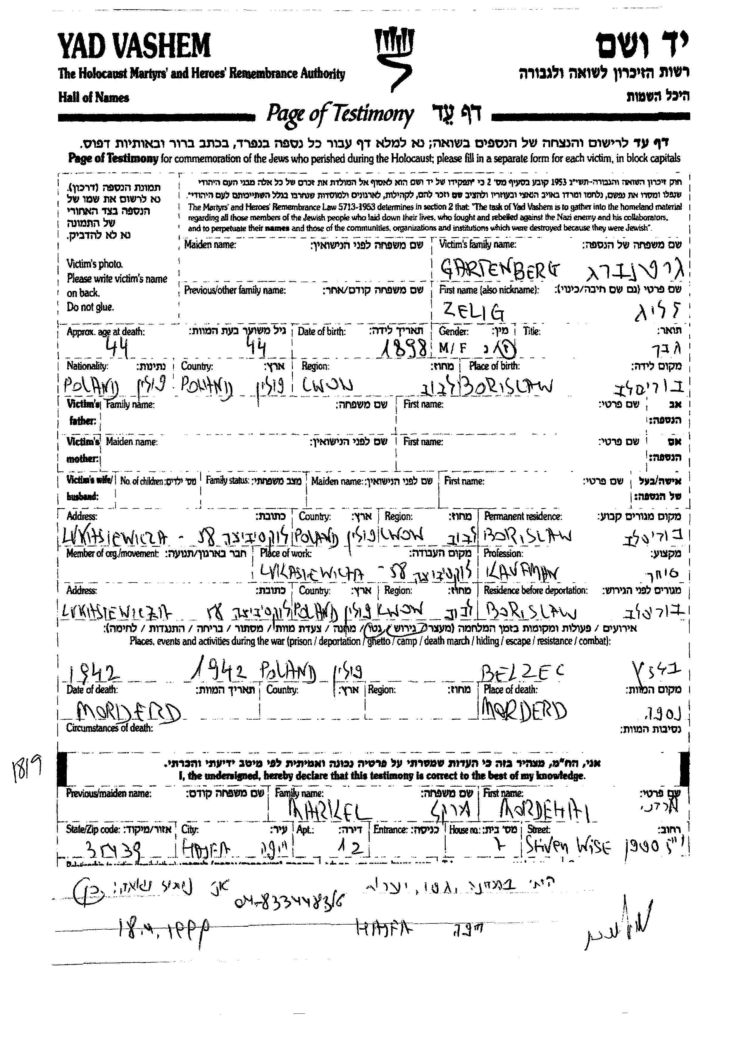 Gartenberg Zelig 1898 Boryslaw, Pologne Feuille de témoignage