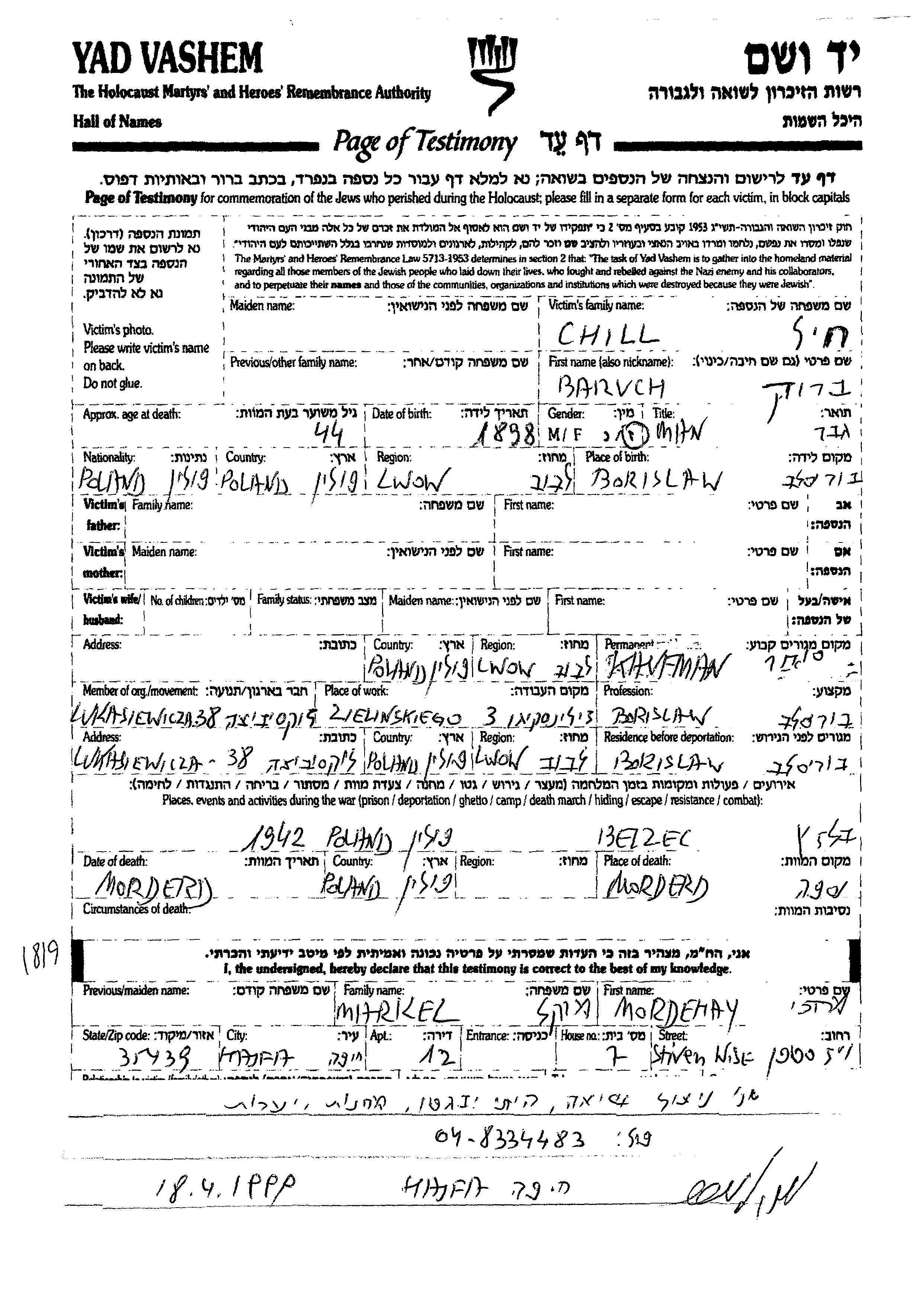 Chill Baruch 1898 Borislav, Pologne Feuille de témoignage