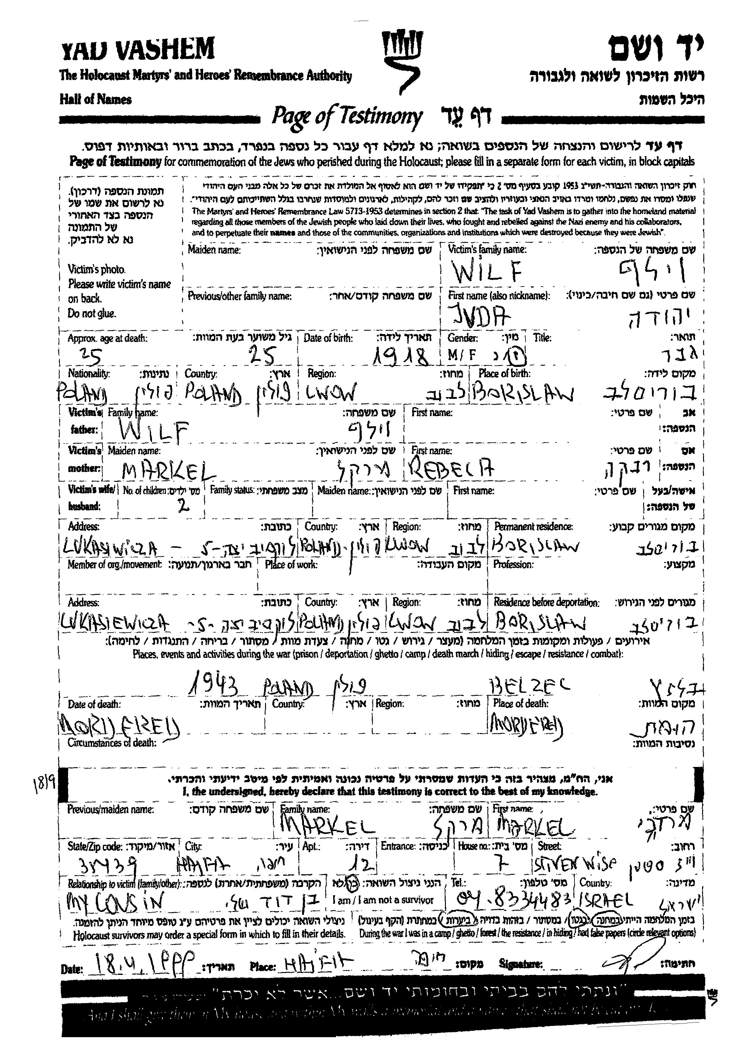 Wilf Yuda 1918 Borislaw, Pologne Feuille de témoignage