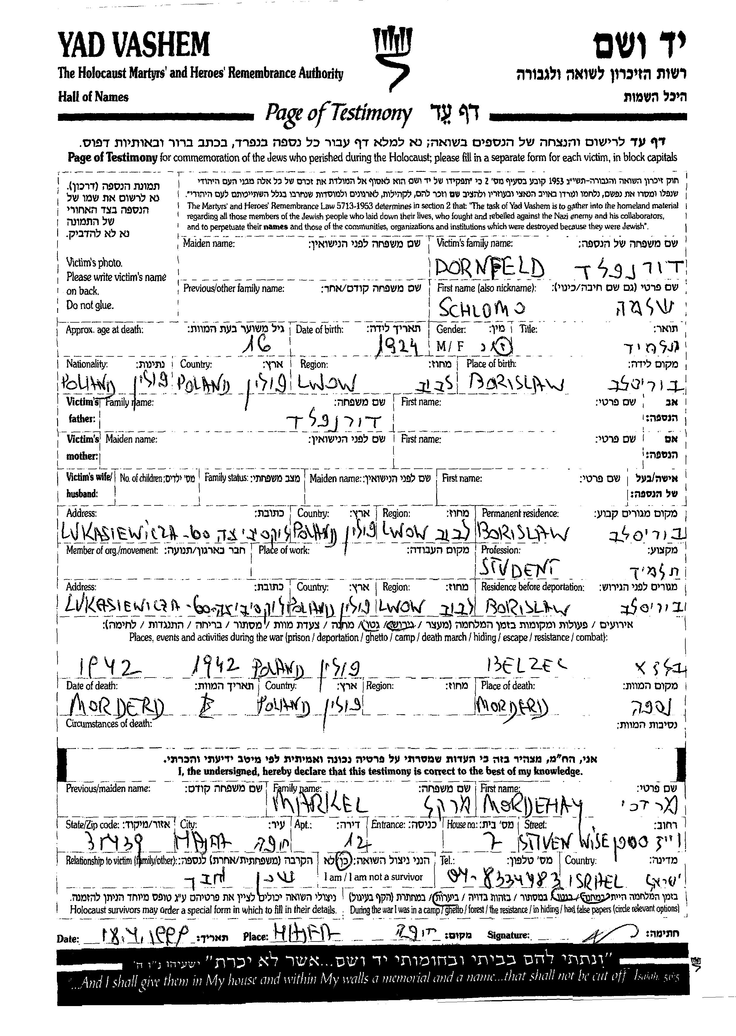 Dornfeld Schlomo 1924 Borislaw, Pologne Feuille de témoignage