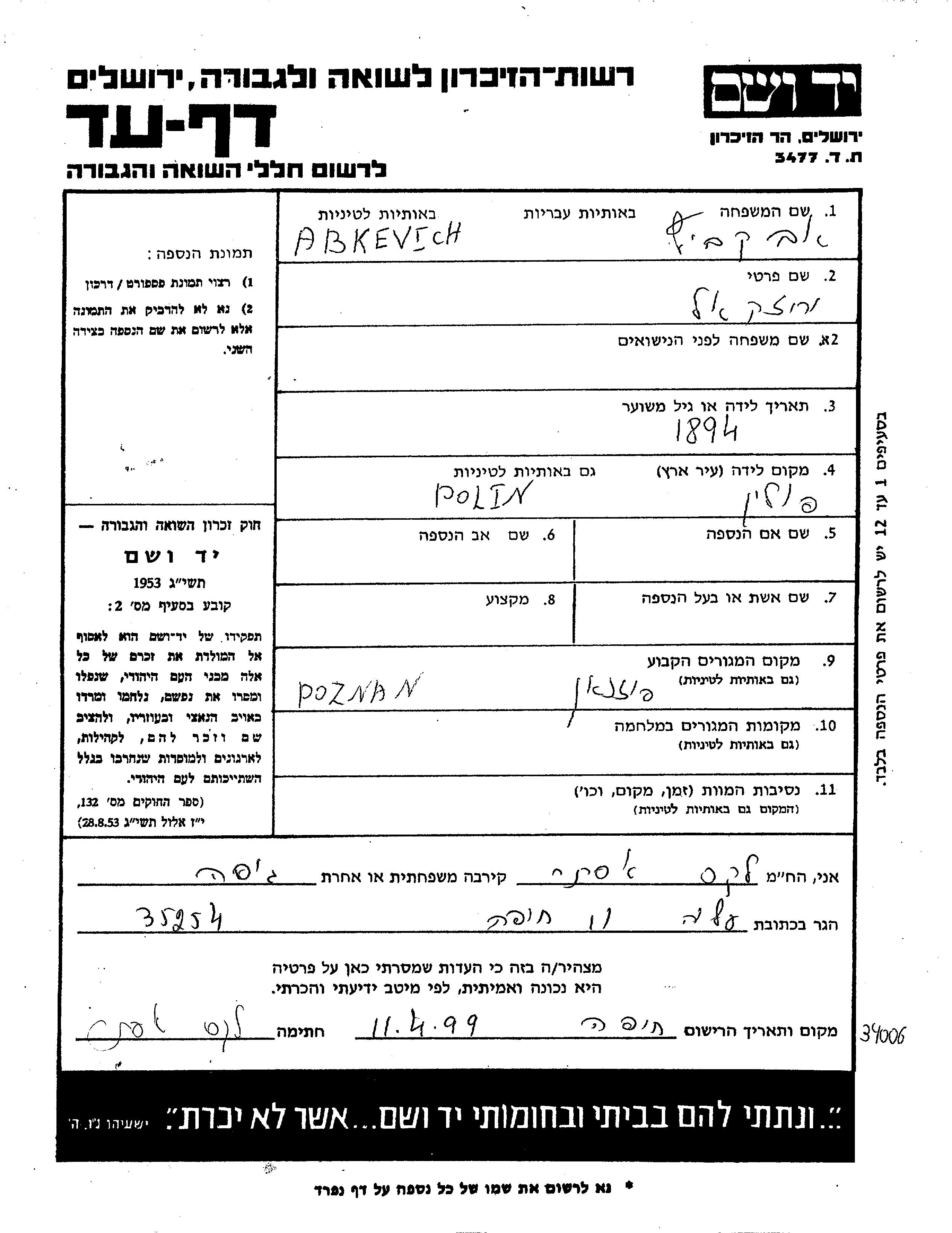Abkevich Yekhezkel 1894 Poznan, Pologne Feuille de témoignage