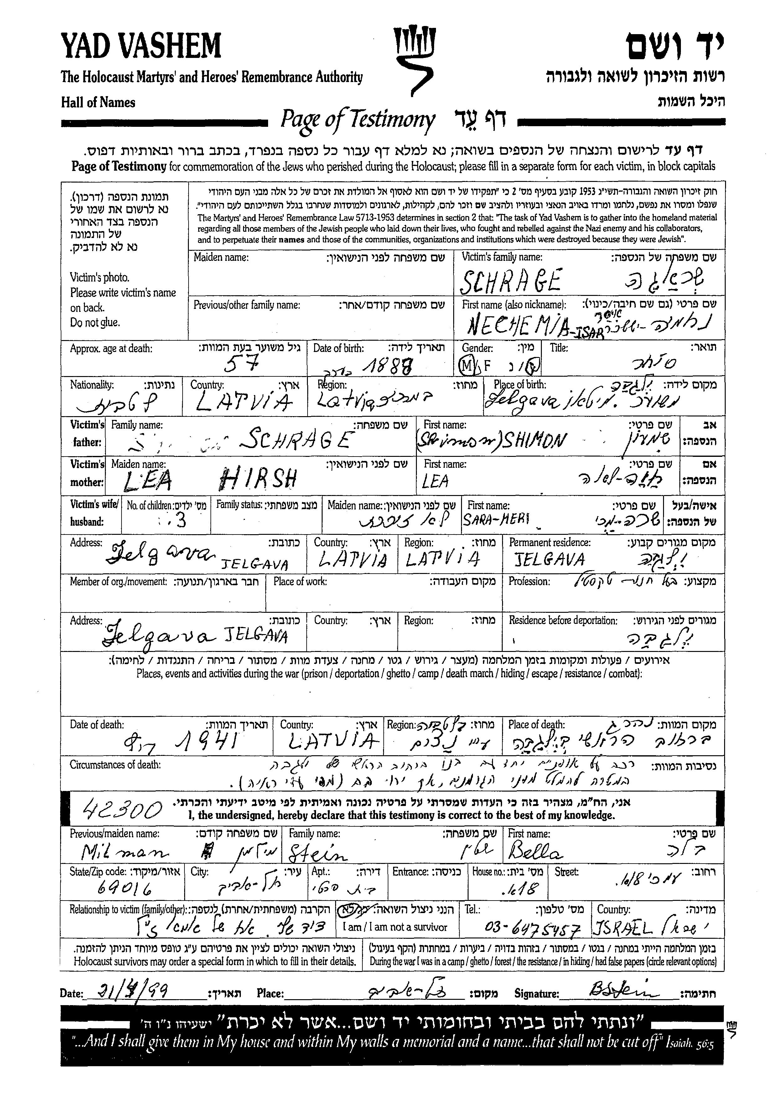 Nechemia Isar Issakhar Schrage est né à Jelgava, Lettonie en 1888, fils de Shimon et de Khaia Lea. Il était Propriétaire d'un magasin de textile et Mariée à Mari Sara. Avant la seconde guerre mondiale il vivait à Jelgava, Lettonie. Au cours de la guerre, il était à Jelgava, Lettonie.