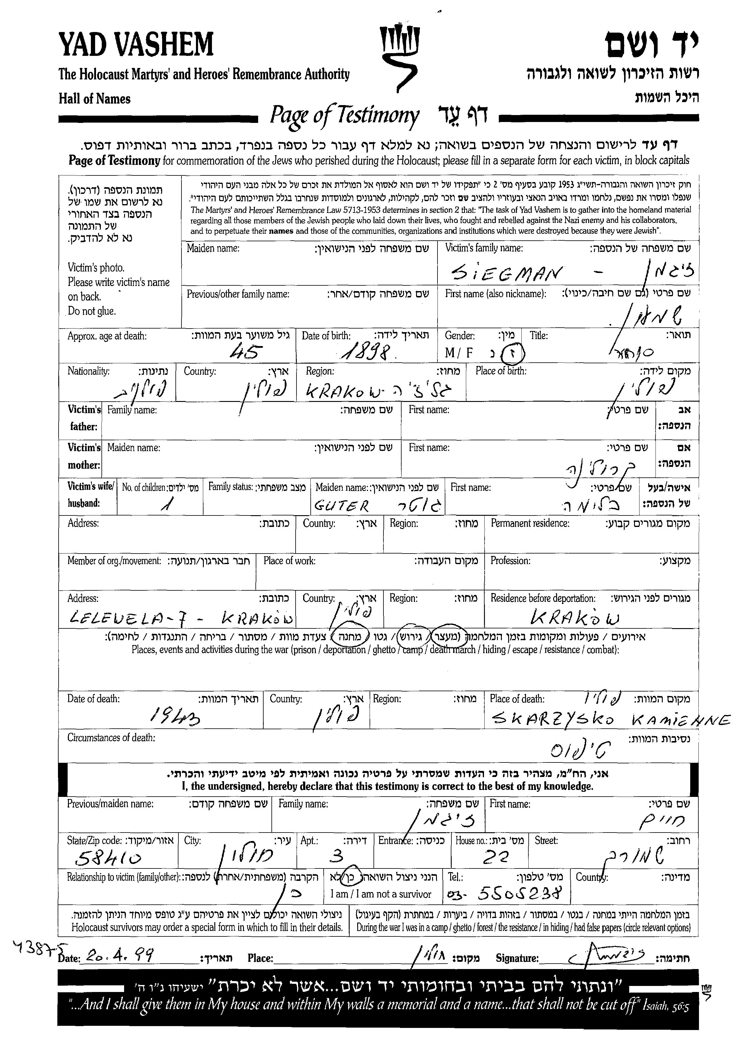 Siegman Shimon 1898 endroit inconnu, Feuille de témoignage