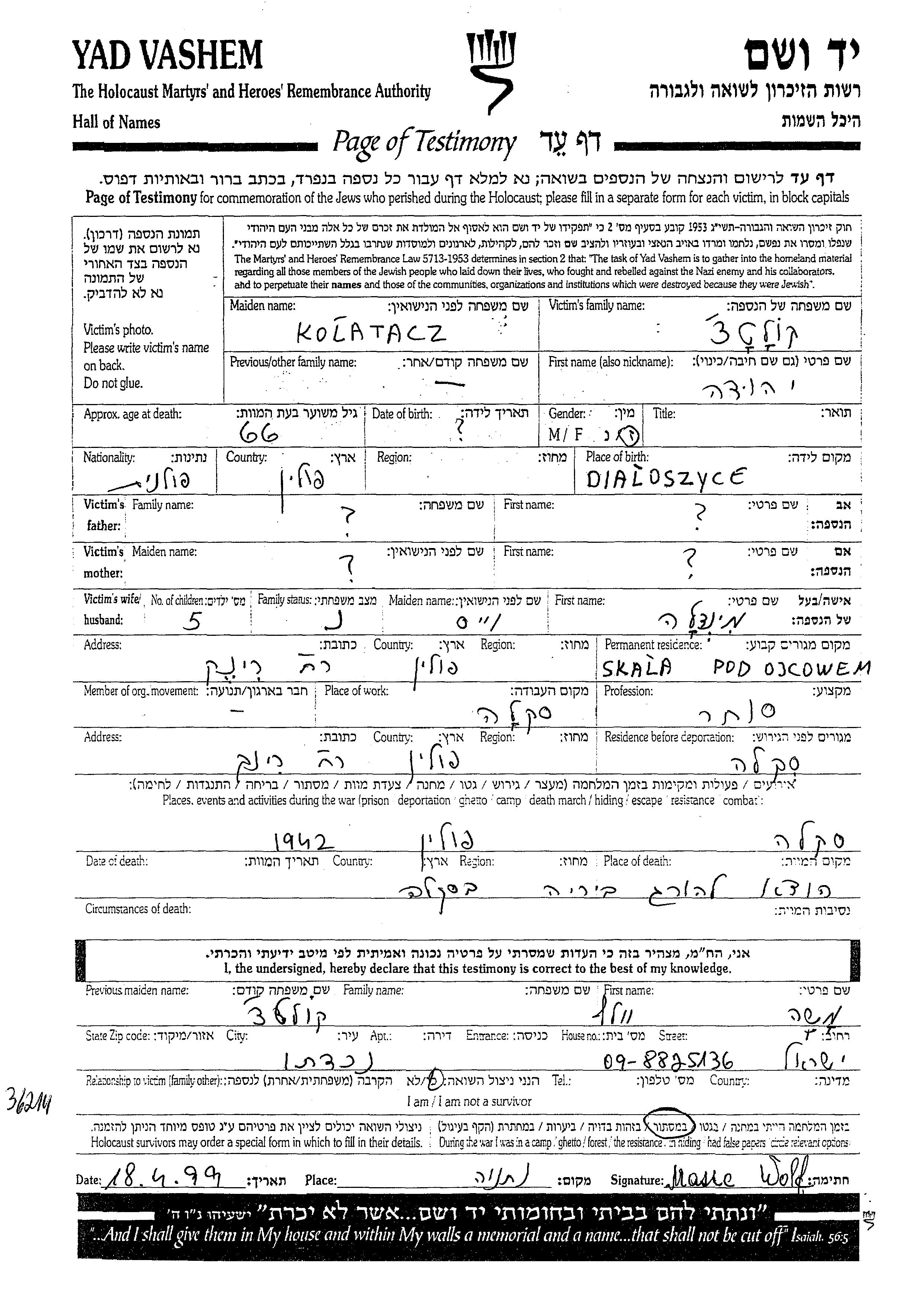 Kolatacz Yehuda Skala, Pologne Feuille de témoignage