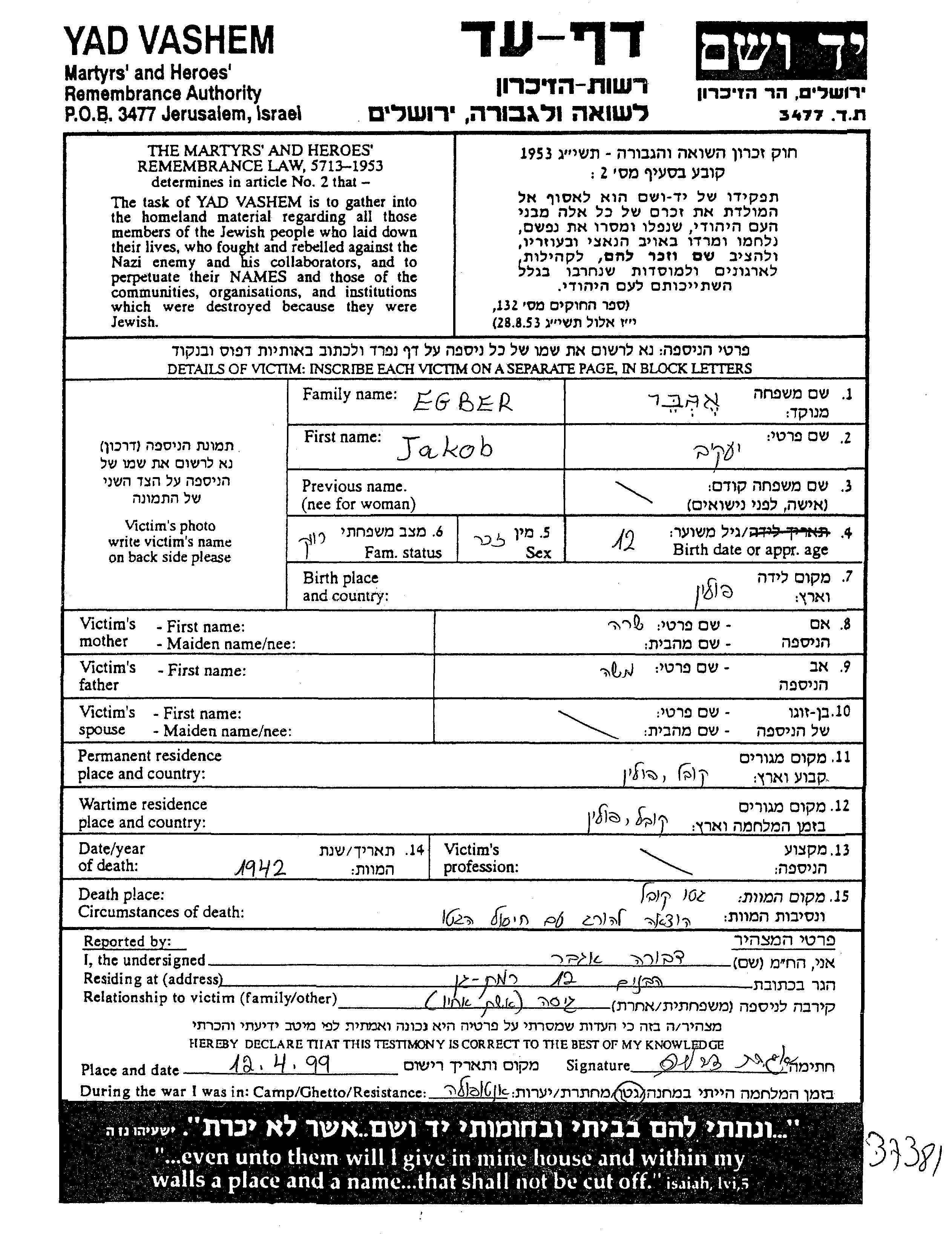 Jakob Egber est né à Pologne, fils de Moshe et de Sara. Il était Célibataire. Avant la seconde guerre mondiale il vivait à Kowel, Pologne. Au cours de la guerre, il était à Kowel, Pologne.