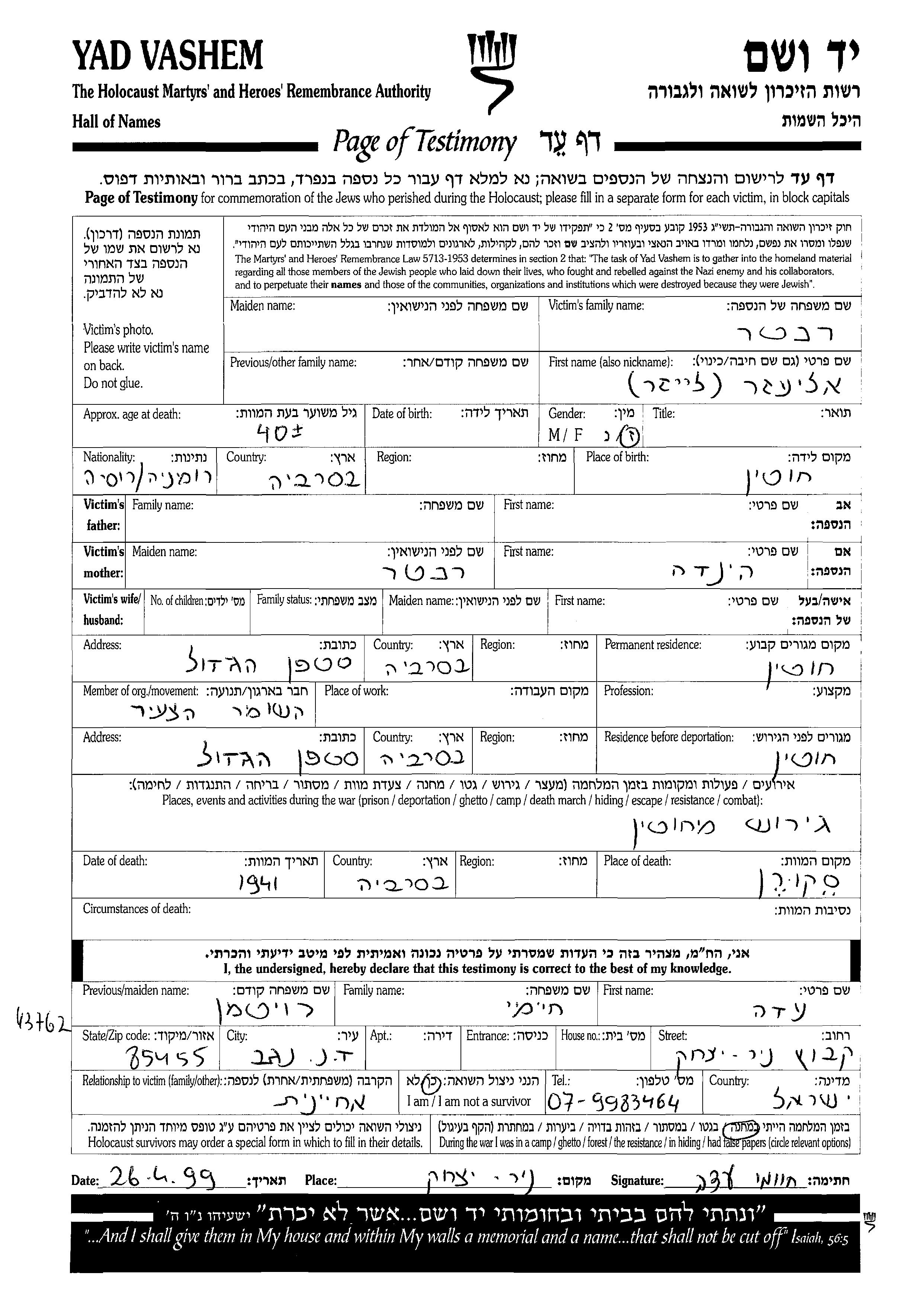 Yad Vashem - Pages of Testimony Names Memorial Collection
