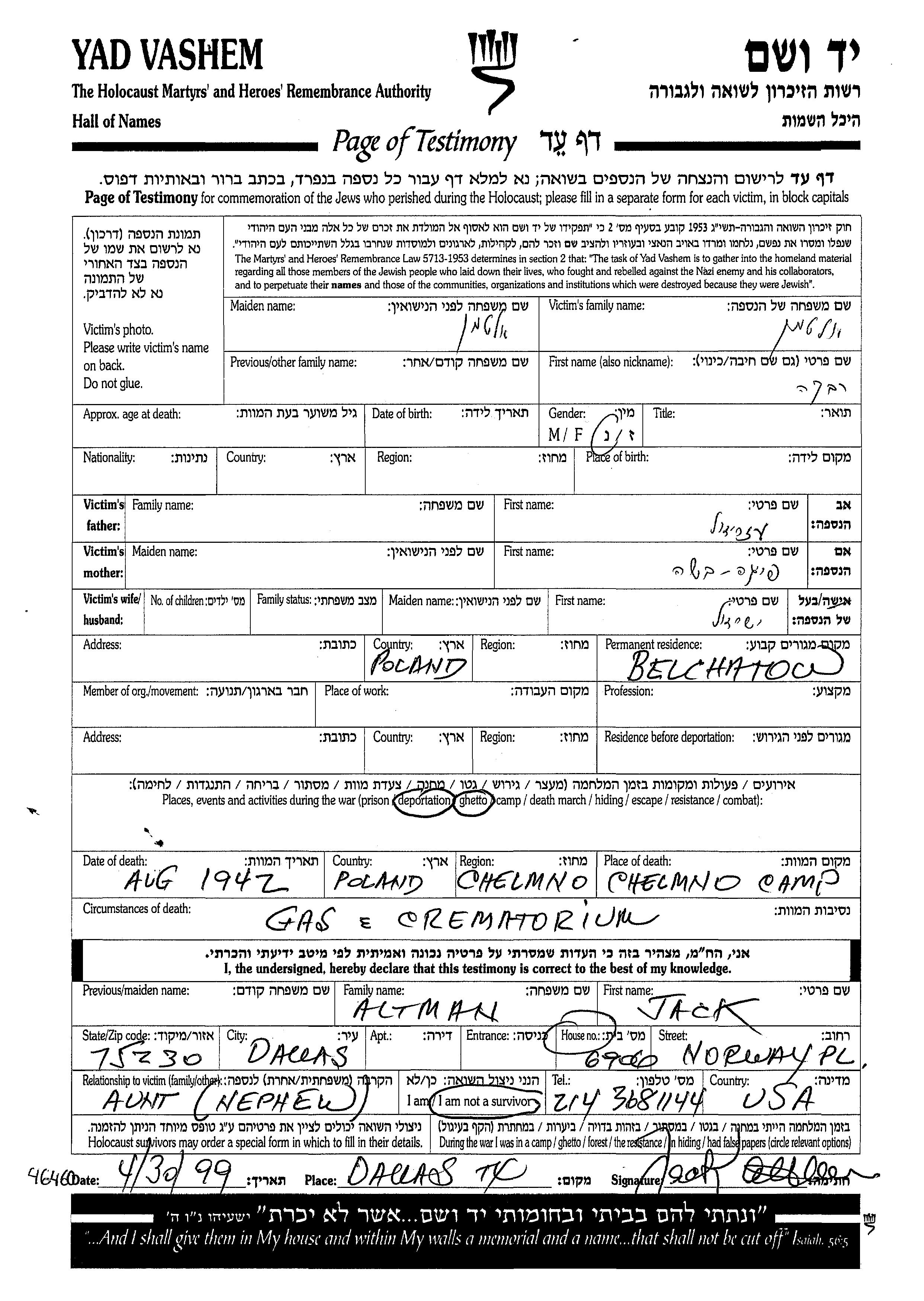 Yad Vashem - Pages of Testimony Names Memorial Collection