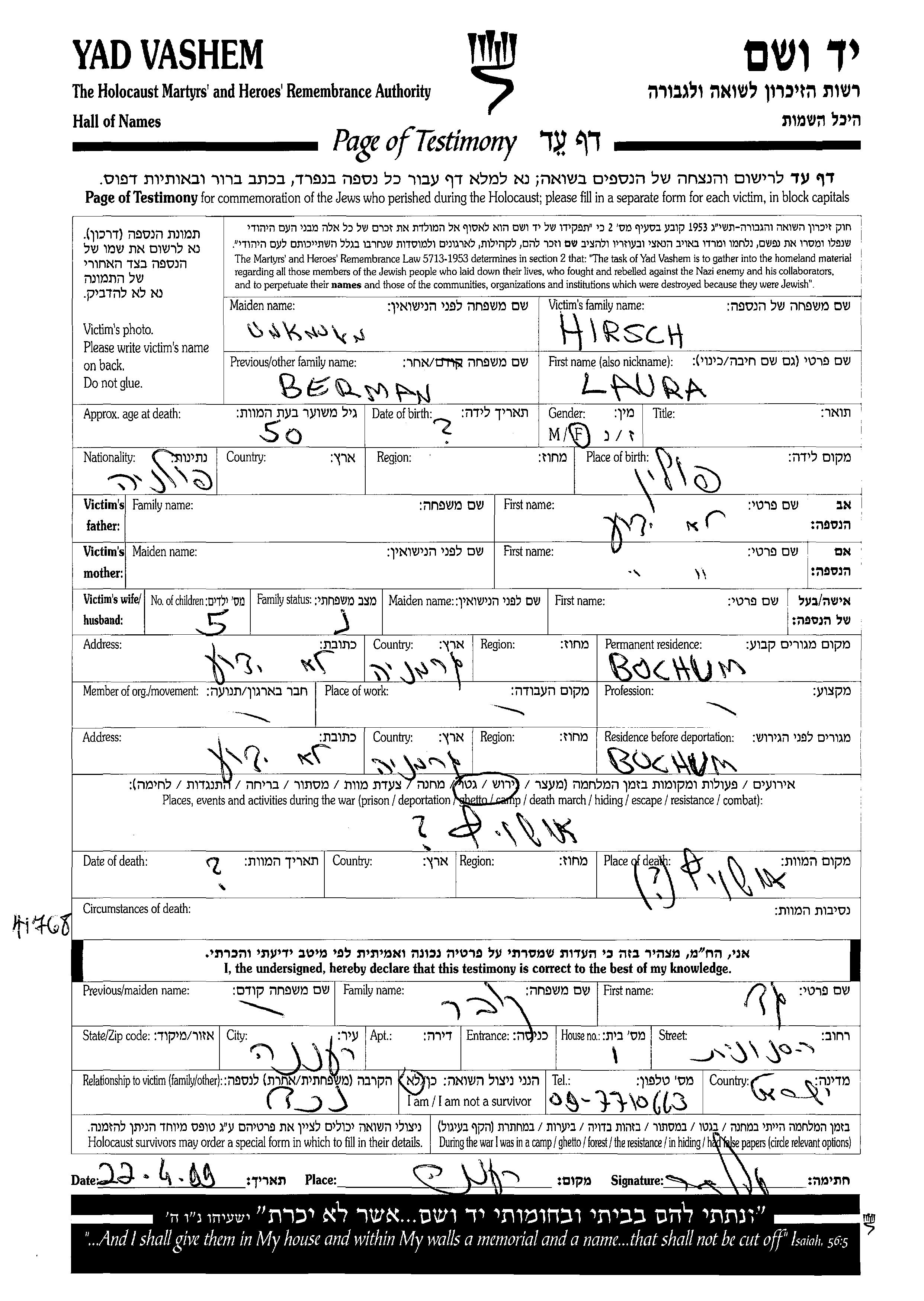 Hirsch Berman Laura Bochum, Allemagne Feuille de témoignage