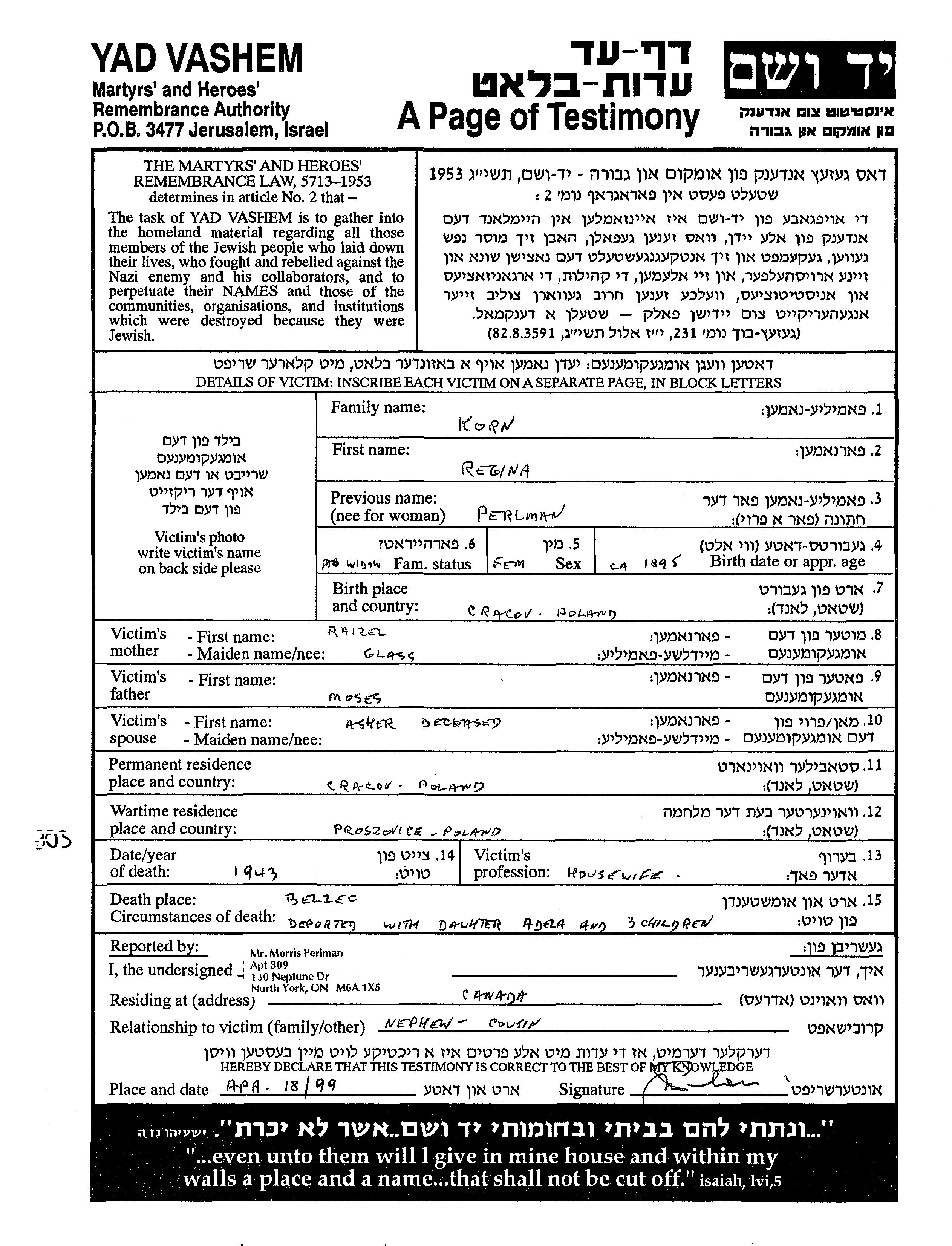 Regina Korn née Perlman est née à Krakow, Pologne en 1895, fille de Moses et de Raizel. Elle était Femme au foyer et veuve de Asher. Avant la seconde guerre mondiale elle vivait à Krakow, Pologne. Pendant la guerre, elle était à Proszowice, Pologne.