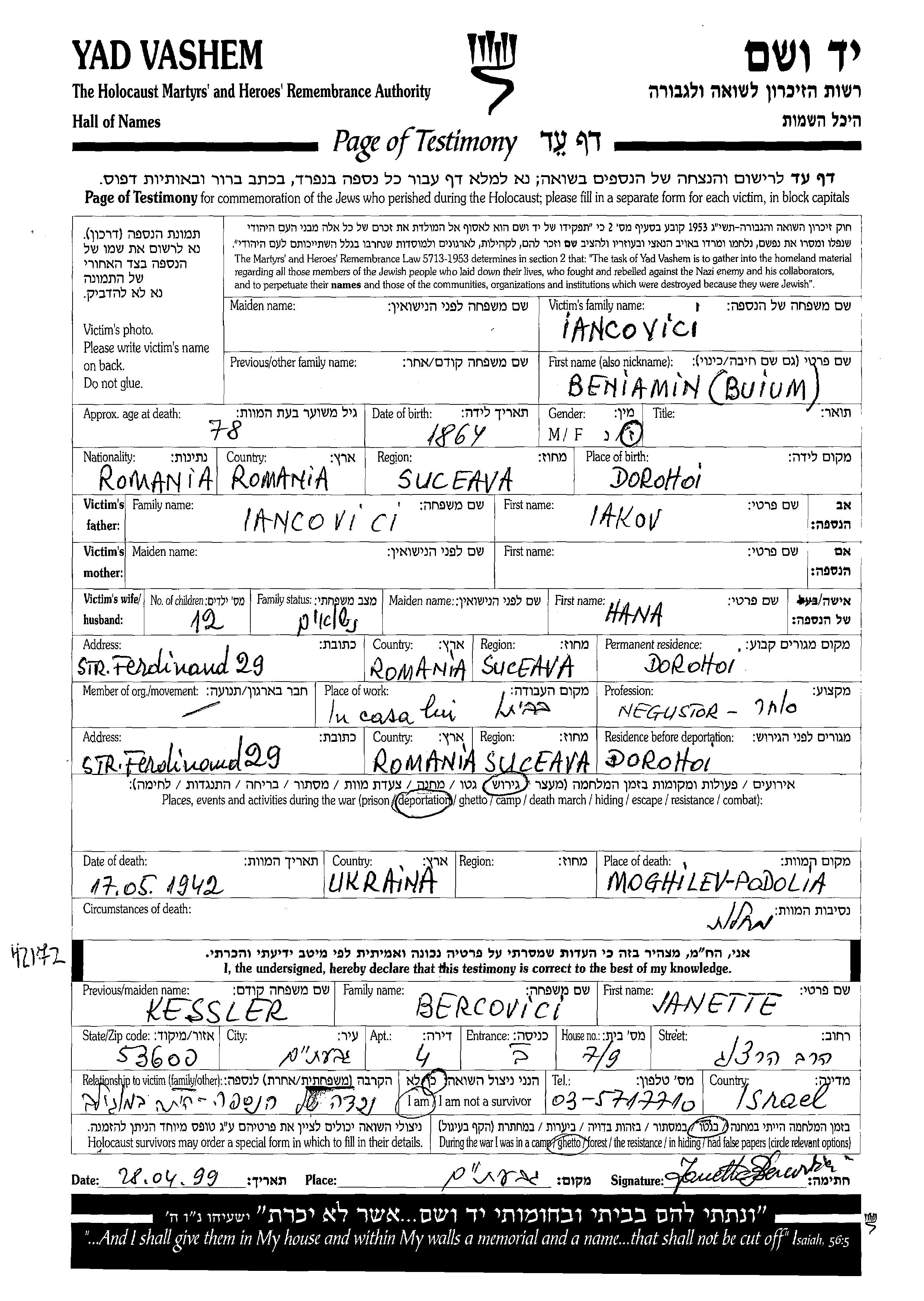 Beniamin a été assassiné pendant la Shoah. Lieu de la mort: Mogilev Podolski, Ukraine (URSS) en 17/05/1942.